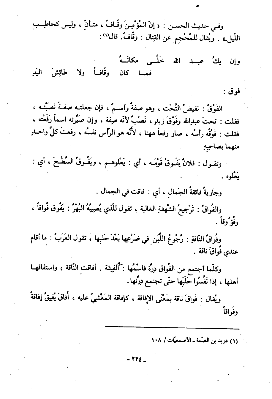 فوق: الفَوْقُ: نقيض التحت، وهو صفة واسم، فإن جعلته صفة نصبته، فقلت: تحت عبد الله وفَوْقَ زيد، نصب لأنه صفة، وإن صيرته اسما رفعته، فقلت: فَوْقُه رأسه، صار رفعا هاهنا، لأنه هو الرأس نفسه، رفعت كل واحد منهما بصاحبه وتقول: فلان يَفْوقُ قومه، أي: يعلوهم، ويَفُوقُ السطح، أي: يعلوه. وجارية فائقةُ الجمال، أي: فاقت في الجمال. والفُواقُ: ترجيع الشهقة الغالبة، تقول للذي يصيبه البهر: يَفُوق فُواقاً، وفُؤُوقاً. وفُواُق الناقة: رجوع اللبن في ضرعها بعد حلبها، تقول العرب: ما أقام عندي فُواقَ ناقة. وكلما اجتمع من الفُواق درة فاسمها: الفيقة. أفاقتِ الناقة، واستفاقها أهلها، إذا نفسوا حلبها حتى تجتمع درتها. ويقال: فَواقَ ناقة بمعنى الإِفاقة، كإفاقة المغشي عليه، أَفاقَ يُفِيقُ إِفاقةً وفواقا