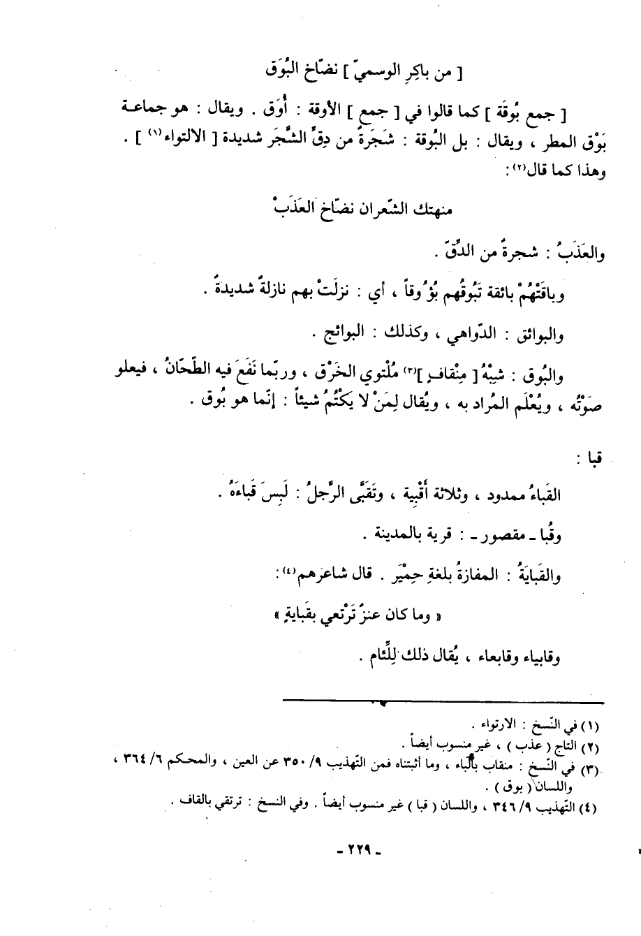 والعَذَبُ: شجرة من الدِّقّ. وباقَتْهُمْ بائقة تَبُوقُهم بُؤُوقاً، أي: نزلت بهم نازلة شديدة. والبوائق: الدواهي، وكذلك: البوائج. والبُوق: شبه [منقاف] «3» ملتوي الخرق، وربما نفع فيه الطحان، فيعلو صوته، ويعلم المراد به، ويقال لمن لا يكتم شيئاً: إنما هو بُوق.