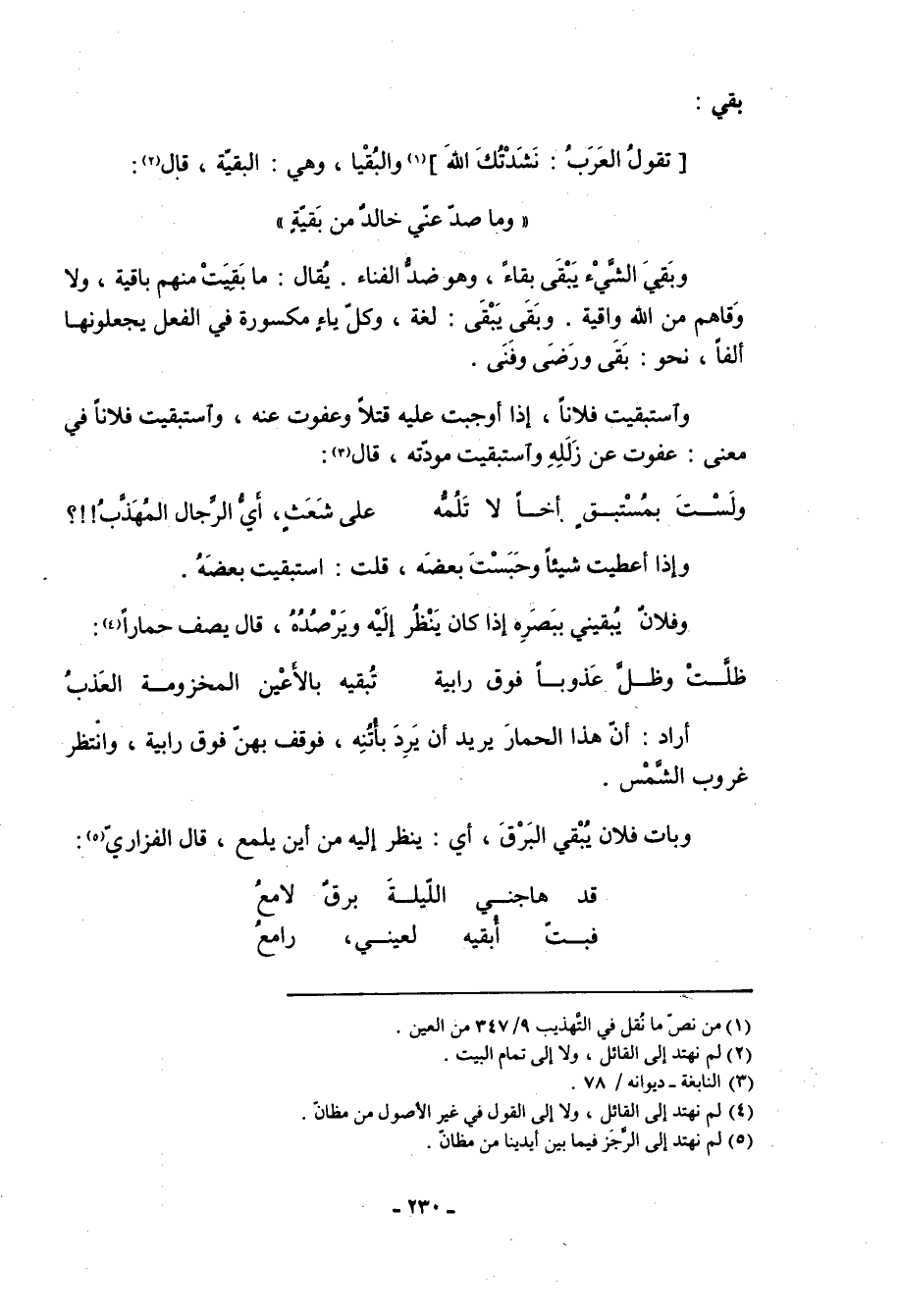 وبَقِيَ الشيء يَبْقَى بقاءً، وهو ضد الفناء يقال: ما بَقِيَتْ منهم باقية، ولا وقاهم من الله واقية. وبقى يبقى: لغة، وكل ياء مكسورة في الفعل يجعلونها ألفاً، نحو: بَقَى ورضى وفَنَى. واستبقيت فلاناً، إذا أوجبت عليه قتلاً وعفوت عنه، واستبقيت فلاناً في معنى: عفوت عن زلله واستبقيت مودته، قال: «3»