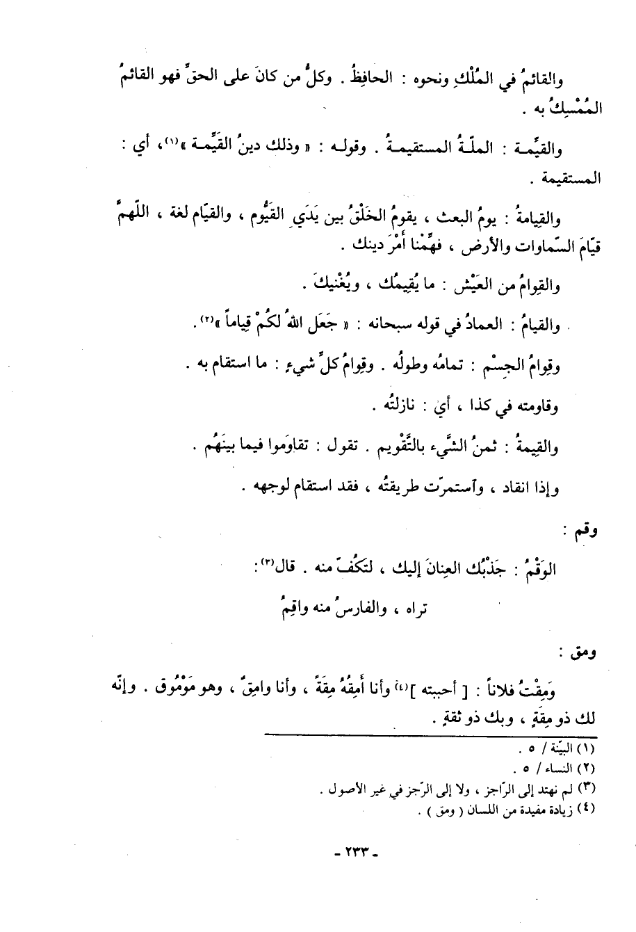 «1» ، أي: المستقيمة. والقِيِّامةُ: يوم البعث، يقوم الخلق بين يدي القَيُّوم، والقيام لغة، اللهم قيام السماوات والأرض، فهمنا أمر دينك. والقِوامُ من العيش: ما يُقِيمُك، ويغنيك. والقيامُ: العماد في قوله سبحانه: جَعَلَ اللَّهُ لَكُمْ قِياماً «2» . وقِوامُ الجسم: تمامه وطوله. وقِوامُ كل شيء: ما استقام به. وقاومته في كذا، أي: نازلته. والقِيمةُ: ثمن الشيء بالتَّقْويم تقول: تقاوَموا فيما بينهم. وإذا انقاد، واستمرت طريقته، فقد استقام لوجهه.