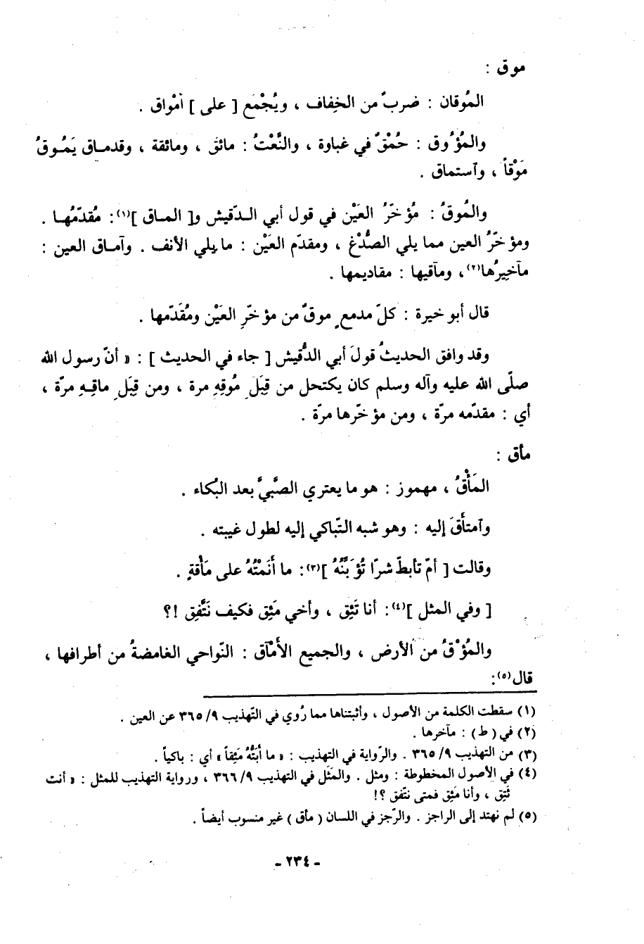 موق: المُوقان: ضرب من الخفاف، ويجمع [على] أمْواق. والمُؤُوق: حمق في غباوة، والنعت: مائق، ومائقة، وقد ماق يمُوقُ مَوْقاً، واستماق. والمُوقُ: مؤخر العين في قول أبي الدقيش و [الماق] «1» : مقدمها. ومؤخر العين مما يلي الصدغ، ومقدم العين: ما يلي الأنف. وآماق العين: مآخيرها «2» ، ومآقيها: مقاديمها. قال أبو خيرة: كل مدمع موقٌ من مؤخر العين ومقدمها. وقد وافق الحديث قول أبي الدقيش