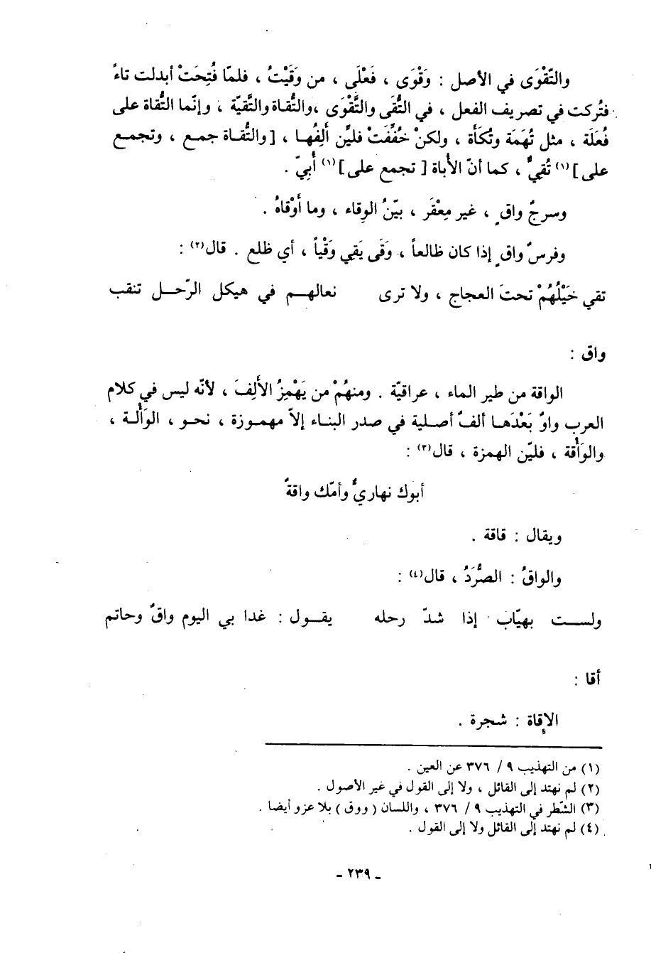 والتّقْوَى في الأصل: وَقْوَى، فعلى، من وَقَيْتُ، فلما فتحت أبدلت تاء فتركت في تصريف الفعل، في التُّقَى والتَّقْوَى، والتُّقاة والتَّقيّة، وإنما التُّقاة على فعلة، مثل تهمة وتكأة، ولكن خففت فلين ألفها، [والتقاة جمع، وتجمع على] تُقِيٌّ، كما أن الأباة [تجمع على] «1» أبي. وسرج واقٍ، غير معقر، بين الوِقاء، وما أَوْقاهُ. وفرس واقٍ، إذا كان ظالعاً وقى يَقِي وَقْياً، أي ظلع. قال: «2»