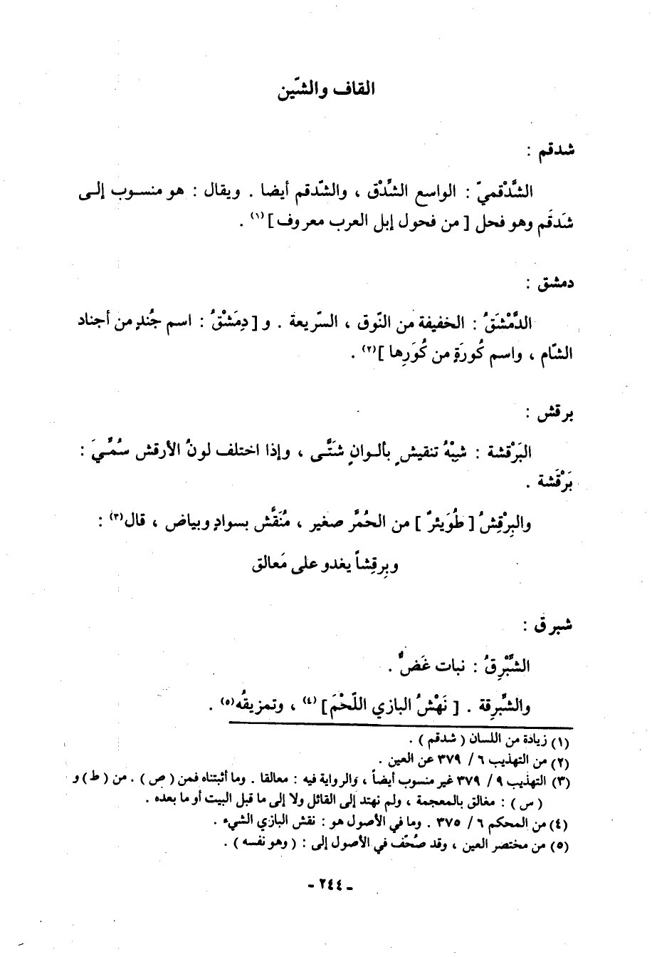 برقش: البَرْقشة: شبه تنقيش بألوان شتى، وإذا اختلف لون الأرقش سمي: برقشة. والبِرْقِشُ [طويئر] من الحمر صغير، منقش بسواد وبياض، قال: «3»