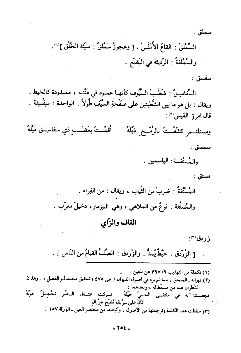 سفسق: السَّفاسِقُ: شطب السيوف كأنها عمود في متنه، ممدودة كالخيط. ويقال: بل هو ما بين الشطبتين على صفحة السيف طولا. الواحدة: سِفْسِقة. قال امرؤ القيس «2» :