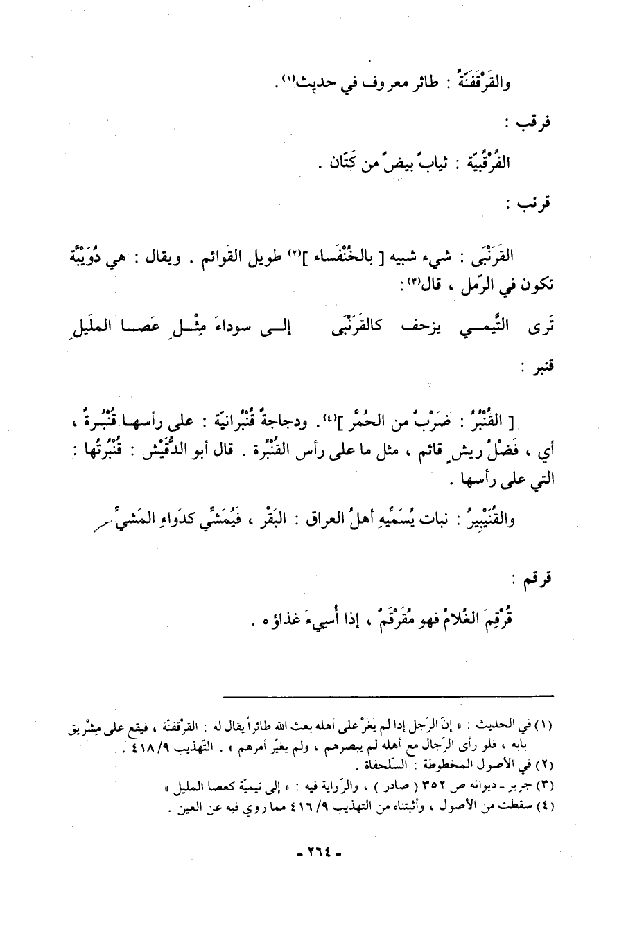 قنبر: [القُنْبُرُ: ضرب من الحمر] «4» . ودجاجة قُنْبُرانيّة: على رأسها قُنْبُرةٌ، أي، فضل ريش قائم، مثل ما على رأس القُنْبُرة. قال أبو الدقيش: قُنْبُرتُها: التي على رأسها. والقُنَيْبِيُر: نبات يسميه أهل العراق: البقر، فيمشي كدواء المشي.