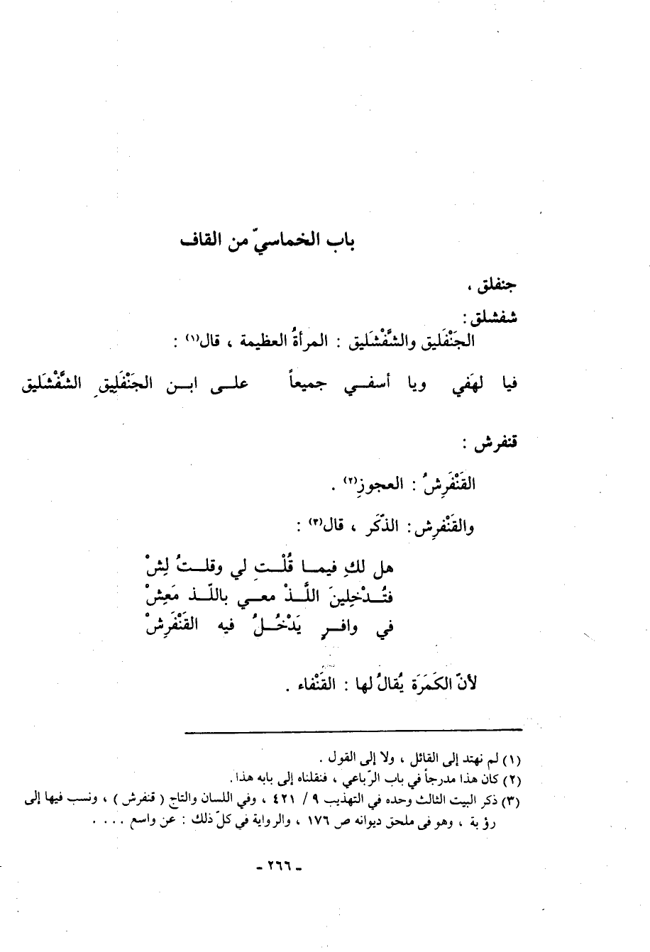 (3) ذكر البيت الثالث وحده في التهذيب 9/ 421، وفي اللسان والتاج (قنفرش) ، ونسب فيها إلى (رؤبة) ، وهو في ملحق ديوانه ص 176، والرواية في كل ذلك: