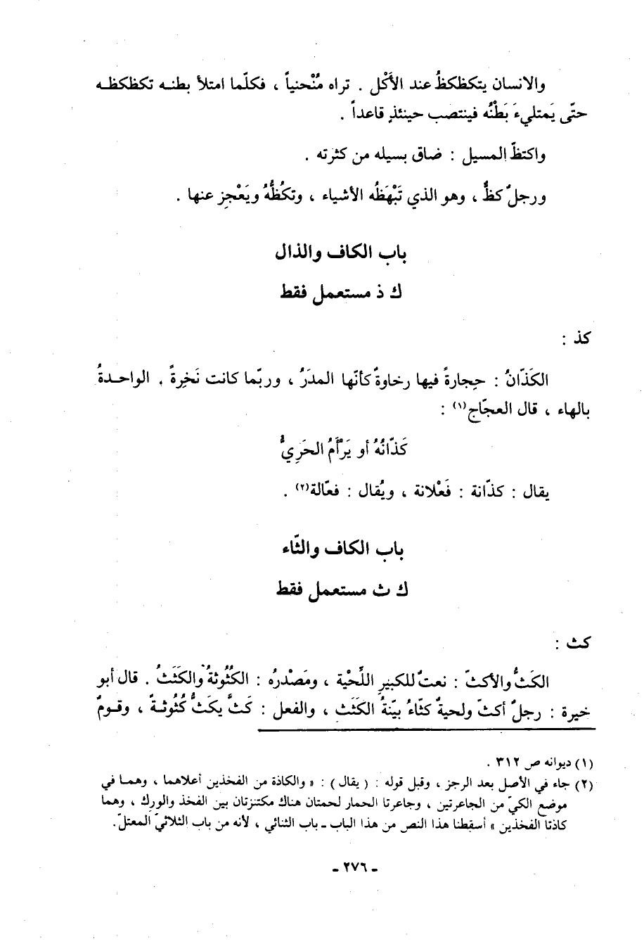 (2) جاء في الأصل بعد الرجز، وقبل قوله: (يقال) : والكاذة من الفخذين أعلاهما، وهما في موضع الكي من الجاعرتين، وجاعرتا الحمار لحمتان هناك مُكْتَنزتانِ بين الفخذ والورك، وهما كاذتا الفخذين أسقطنا هذا النص من هذا الباب- باب الثنائي، لأنه من باب الثلاثي المعتل.