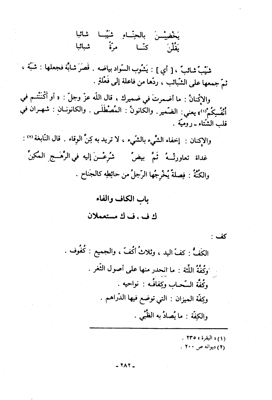 شَيْبٌ شائبٌ، [أي] : يَشُوب السواد بياضه. قصر شابَّة فجعلها شَبّة، ثم جمعها على الشّبائب، ردها من فاعلة إلى فَعْلةٍ. والإِكْنانُ: ما أضمرت في ضميرك، قال الله عز وجل: أَوْ أَكْنَنْتُمْ فِي أَنْفُسِكُمْ «1» يعني: الضمير. والكانونُ: المصطلى. والكانونانِ: شهران في قلب الشتاء- رومية. والإِكنان: إخفاء الشيء بالشيء، لا تريد به كِنَّ الوقاء. قال النابغة: «2»
