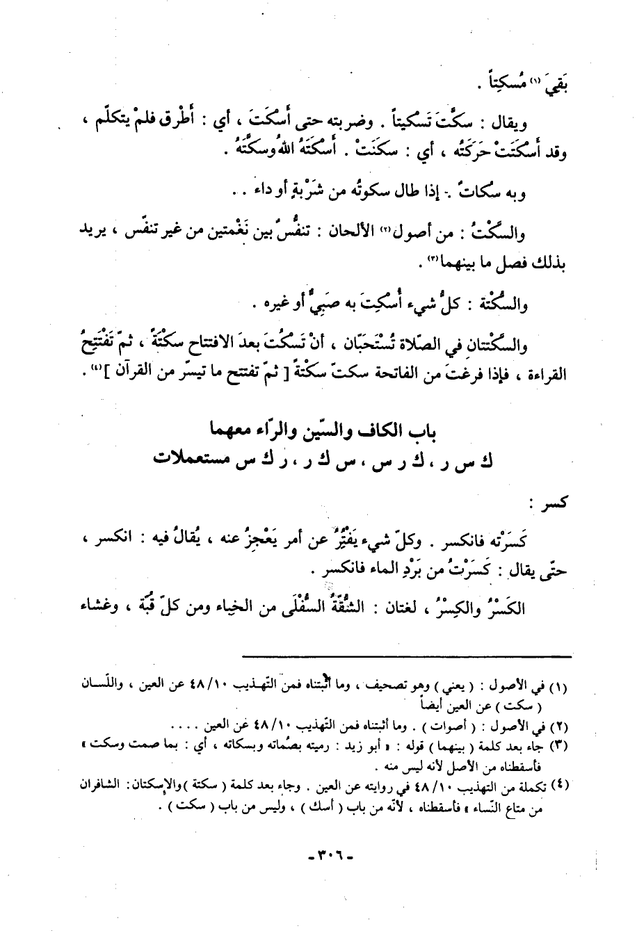 (4) تكملة من التهذيب 10/ 48 في روايته عن العين. وجاء بعد كلمة (سكتة) والإسكتان: الشافران من متاع النساء فأسقطناه، لأنه من باب (أسك) ، وليس من باب (سكت) .