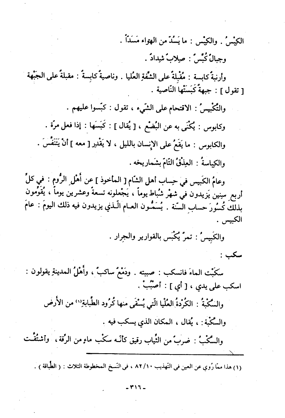 سكب: سَكَبْت الماء فانسكب: صببته. ودمع ساكب، وأهل المدينة يقولون: اسكب على يدي، [أي] : اصبب. والسَّكْبةُ: الكردة العليا التي يسقى منها كرود الطبابة «1» من الأرض والسَّكْبةُ:، يقال، المكان الذي يسكب فيه. والسَّكْبُ: ضرب من الثياب رقيق كأنه سَكْب ماء من الرقة، واشتقت