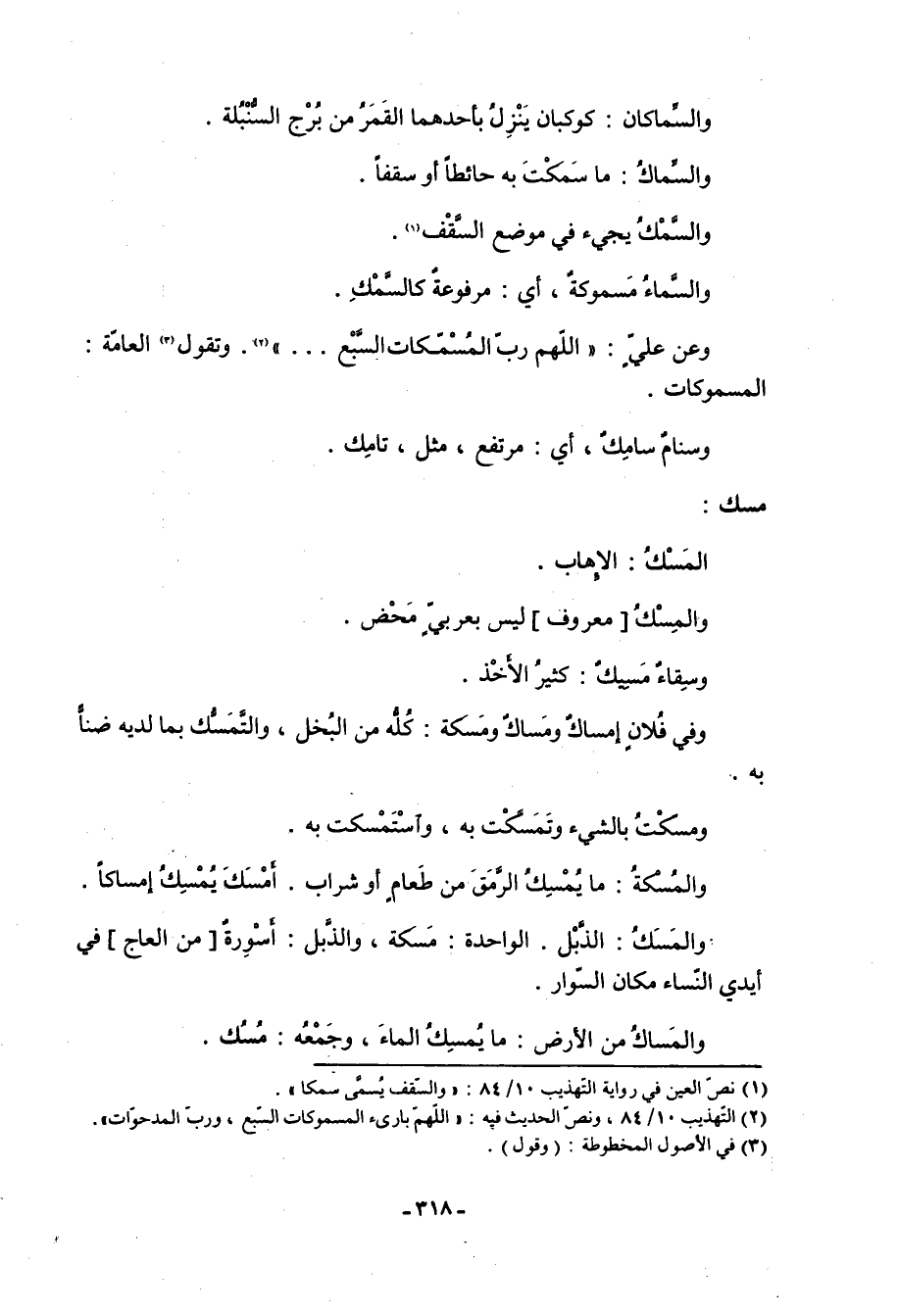 مسك: المَسْكُ: الإهاب. والمِسْكُ [معروف] ليس بعربي محض. وسِقاء مَسِيكٌ: كثير الأخذ. وفي فلان إِمْساكٌ ومَساكٌ ومَسكة: كله من البخل، والتَّمَسُّك بما لديه ضنأ به. ومسكْتُ بالشيء وتَمَسَّكْت به، واسْتَمْسكت به. والمُسْكةُ: ما يمسك الرمق من طعام أو شراب. أَمْسَكَ يُمْسِكُ إِمساكاً. والمَسَكُ: الذبل. الواحدة: مَسكة، والذبل: أسورة [من العاج] في أيدي النساء مكان السوار. والمَساكُ من الأرض: ما يُمسِكُ الماء، وجمعه: مسك.