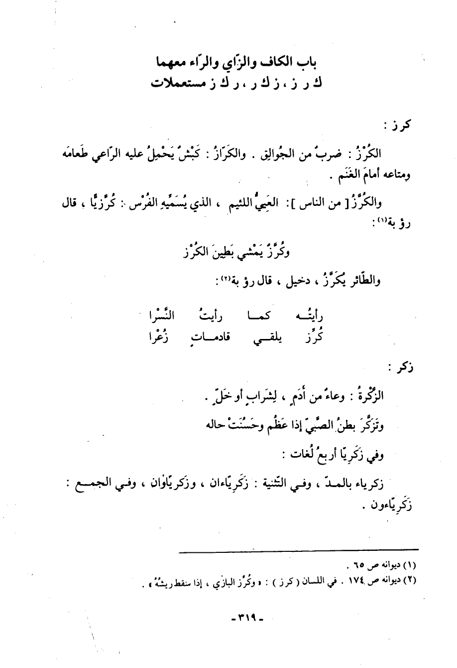 باب الكاف والزاي والراء معهما ك ر ز، ز ك ر، ر ك ز مستعملات