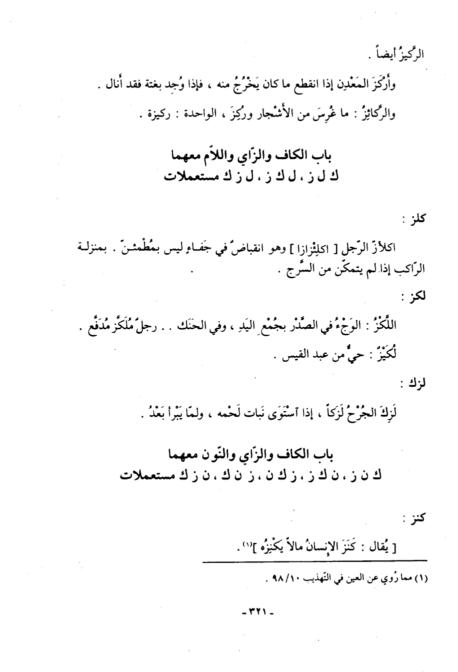 باب الكاف والزاي والنون معهما ك ن ز، ن ك ز، ز ك ن، ز ن ك، ن ز ك مستعملات