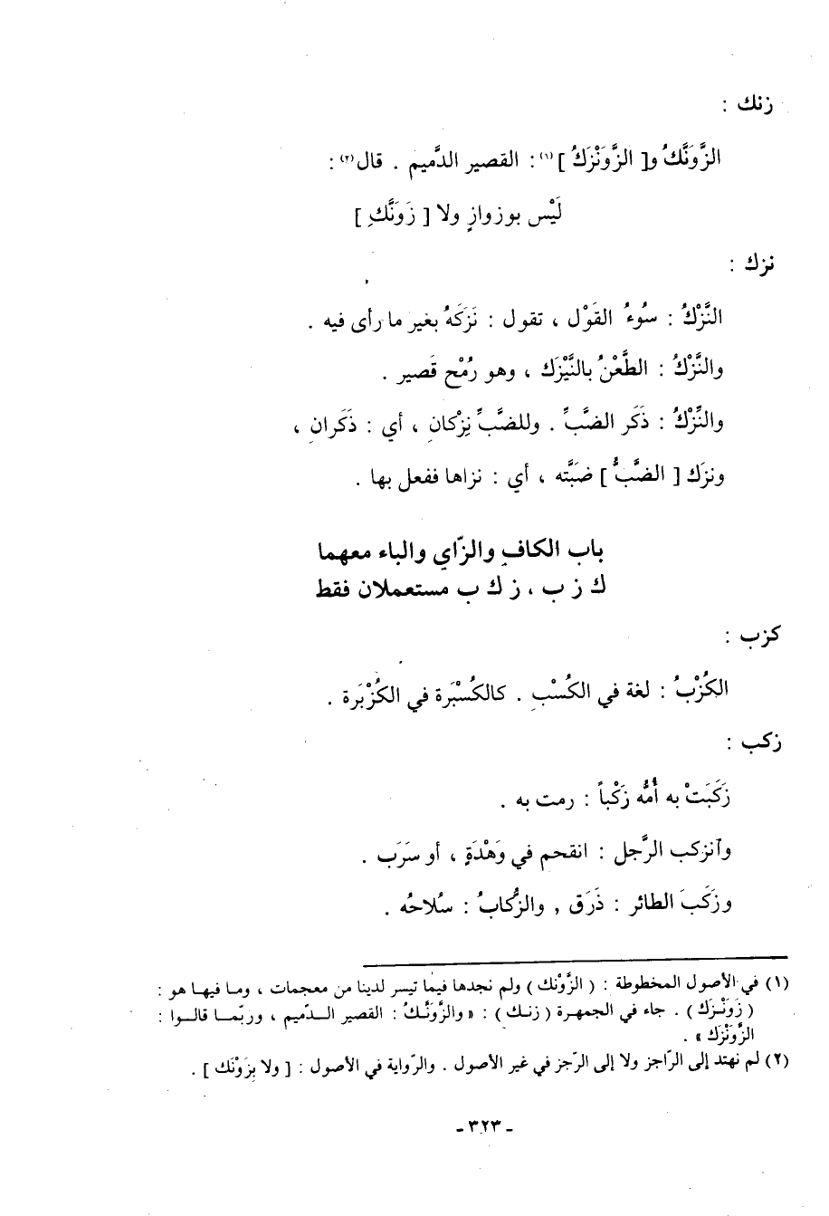 (1) في الأصول المخطوطة: (الزونك) ولم نجدها فيما تيسر لدينا من معجمات، وما فيها هو: (زونزك) . جاء في الجمهرة (زنك) : والزونك: القصير الدميم، وربما قالوا: الزونزك.