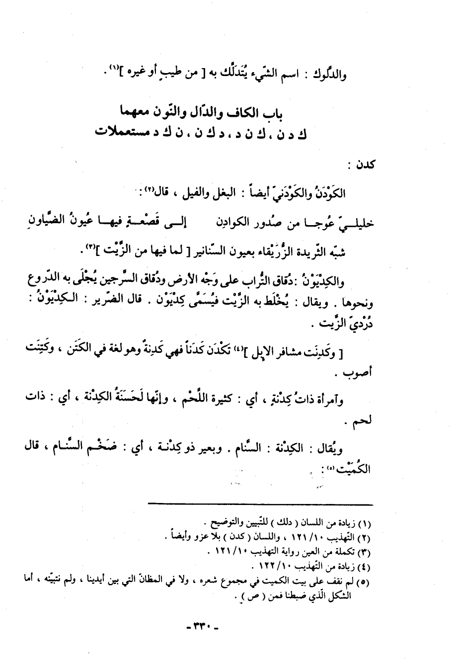 شبه الثريدة الزريقاء بعيون السنانير [لما فيها من الزيت] «3» . والكِدْيَوْنُ: دقاق التراب على وجه الأرض ودقاق السرجين يجلى به الدروع ونحوها. ويقال: يخلط به الزيت فيسمى كديون. قال الضرير: الكديون: دردي الزيت. [وكَدِنَت مشافر الإبل] «4» تكْدَن كَدَناً فهي كَدِنةٌ وهو لغة في الكَتَن، وكَتِنَت أصوب. وامرأة ذات كِدْنةٍ، أي: كثيرة اللحم، وإنها لحسنة الكِدْنة، أي: ذات لحم. ويقال: الكِدْنة: السنام. وبعير ذو كِدْنة، أي: ضخم السنام، قال الكميت: «5»