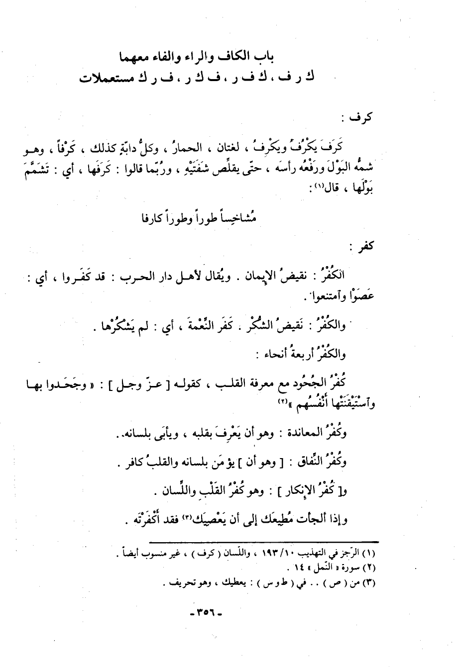 باب الكاف والراء والفاء معهما ك ر ف، ك ف ر، ف ك ر، ف ر ك مستعملات
