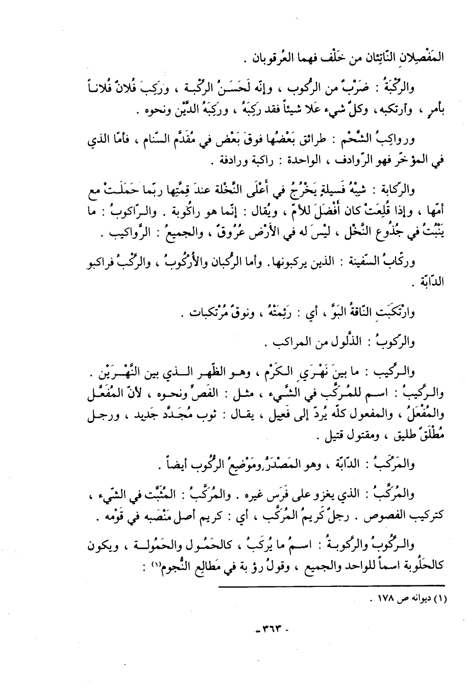 المفصلان الناتئان من خلف فهما العرقوبان. والرِّكْبَةُ: ضرب من الركوب، وإنه لحسن الرِّكبة، ورَكِبَ فلان فلاناً بأمر، وارتكبه، وكل شيء علا شيئاً فقد رَكِبَهُ، ورَكِبَهُ الدين ونحوه. ورواكِبُ الشحم: طرائق بعضها فوق بعض في مقدم السنام، فأما الذي في المؤخر فهو الروادف، الواحدة: راكبة ورادفة. والرّكابة: شبه فسيلة يخرج في أعلى النخلة عند قمتها ربما حملت مع أمها، وإذا قلعت كان أفضل للأم، ويقال: إنما هو راكُوبة. والرّاكوبُ: ما ينبت في جذوع النخل، ليس له في الأرض عروق، والجميع: الرَّواكيب. وركّابُ السفينة: الذين يركبونها. وأما الرُّكبان والأُرْكُوبُ، والرَّكْبُ فراكبو الدابة. وارْتكَبَت الناقة البو، أي: رئمته، ونوق مُرْتكبات. والرّكوبُ: الذلول من المراكب. والرَّكيب: ما بين نهري الكرم، وهو الظهر الذي بين النهرين. والرَّكيبُ: اسم للمركب في الشيء، مثل: الفص ونحوه، لأن المُفَعَّل والمُفْعَلُ، والمفعول كله يرد إلى فَعِيل، يقال: ثوب مُجدد جديد، ورجل مطلق طليق، ومقتول قتيل. والمَرْكَبُ: الدابة، وهو المصدر وموضع الركوب أيضاً. والمُرَكَّبُ: الذي يغزو على فرس غيره. والمُرَكَّبُ: المثبت في الشيء، كتركيب الفصوص. رجل كريم المُرَكَّب، أي: كريم أصل منصبه في قومه. والرَّكُوبُ والرَّكوبةُ: اسم ما يركب، كالحمول والحمولة، ويكون كالحلوبة اسماً للواحد والجميع، وقول رؤبة في مطالع النجوم «1» :