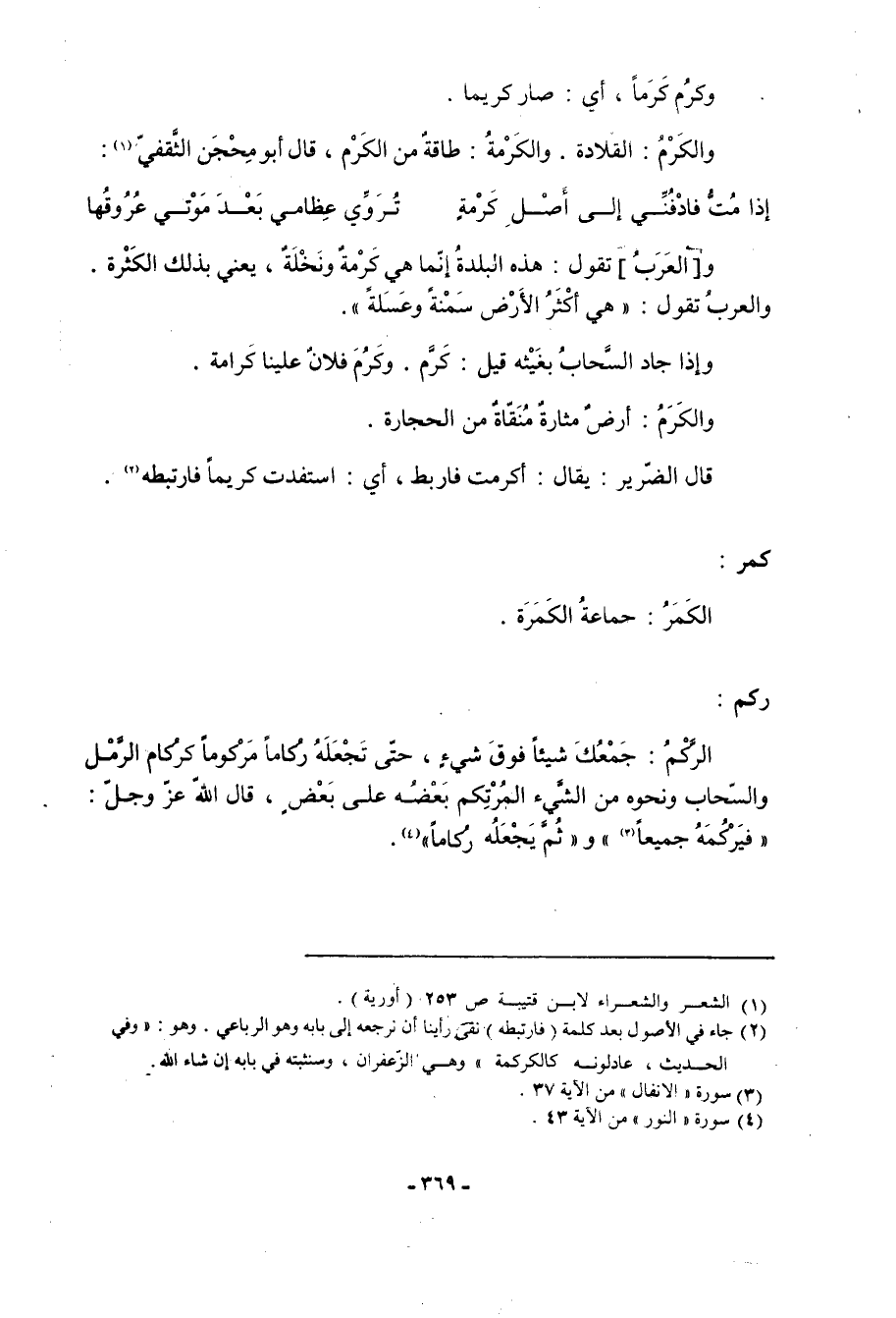 و [العرب] تقول: هذه البلدة إنما هي كَرْمةٌ ونخلة، يعني بذلك الكثرة. والعرب تقول: هي أكثر الأرض سمنة وعسلة. وإذا جاد السحاب بغيثه قيل: كَرَّم. وكَرُمَ فلان علينا كَرامة. والكَرَمُ: أرض مثارة منقاة من الحجارة. قال الضرير: يقال: أكرمت فاربط، أي: استفدت كريماً فارتبطه «2» .