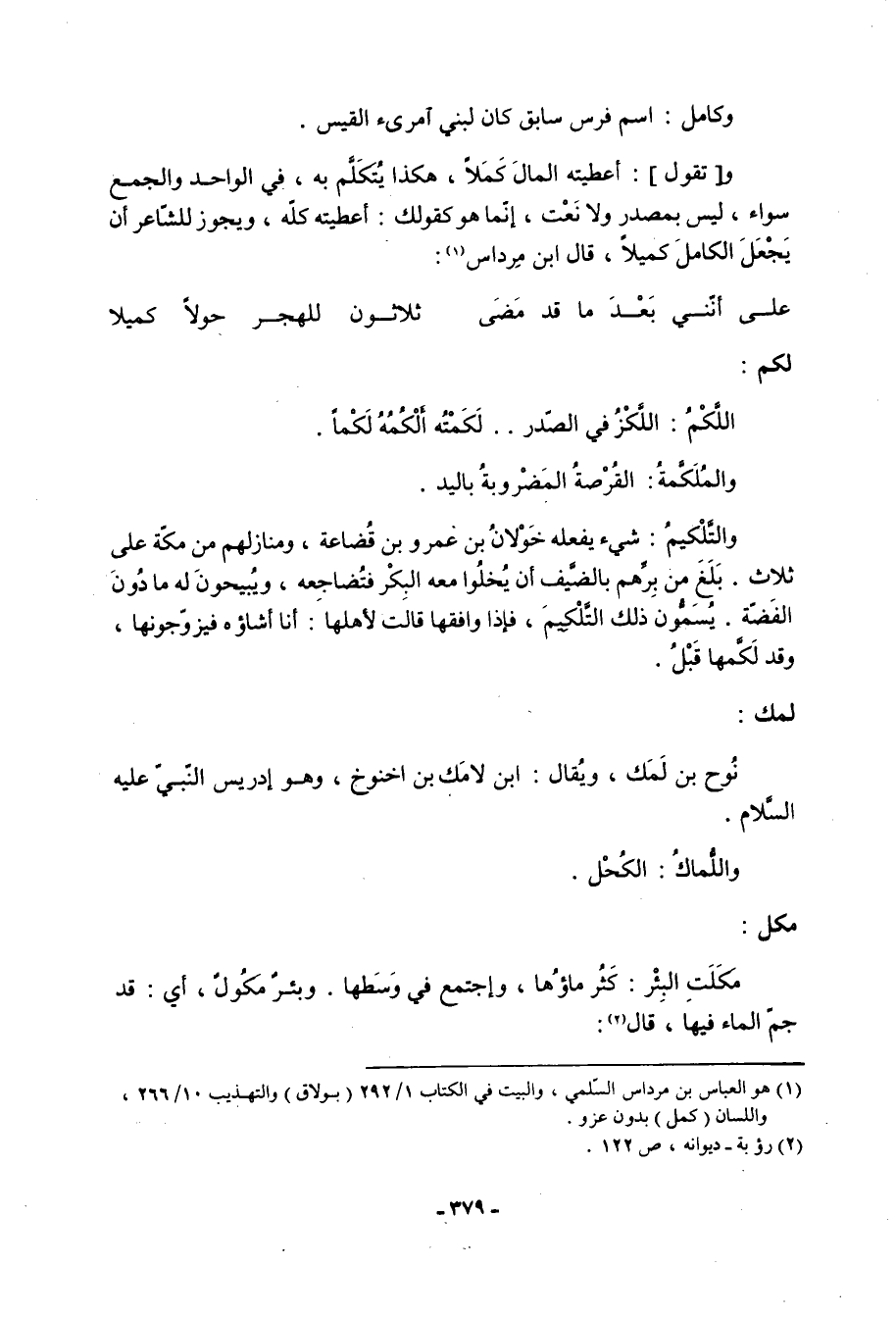 (1) هو (العباس بن مرداس السلمي) ، والبيت في الكتاب 1/ 292 (بولاق) والتهذيب 10/ 266، واللسان (كمل) بدون عزو.