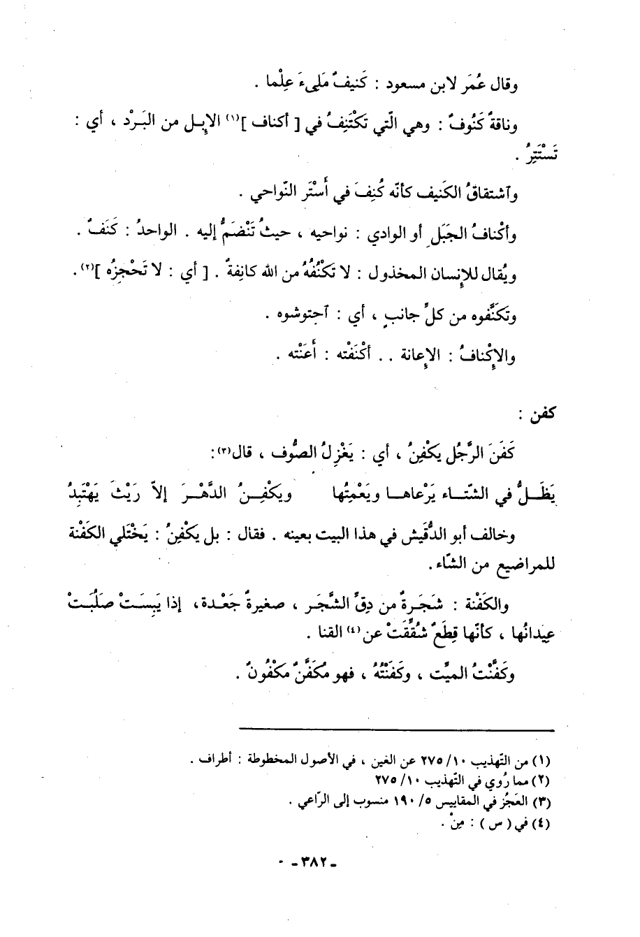 وخالف أبو الدقيش في هذا البيت بعينه. فقال: بل يَكْفِنُ: يختلي الكَفْنة للمراضيع من الشاء. والكَفْنة: شجرة من دق الشجر، صغيرة جعدة، إذا يبست صلبت عيدانها، كأنها قطع شققت عن «4» القنا. وكَفَّنتُ الميت، وكَفَنْتُهُ، فهو مكَفنٌ مكفُونٌ.
