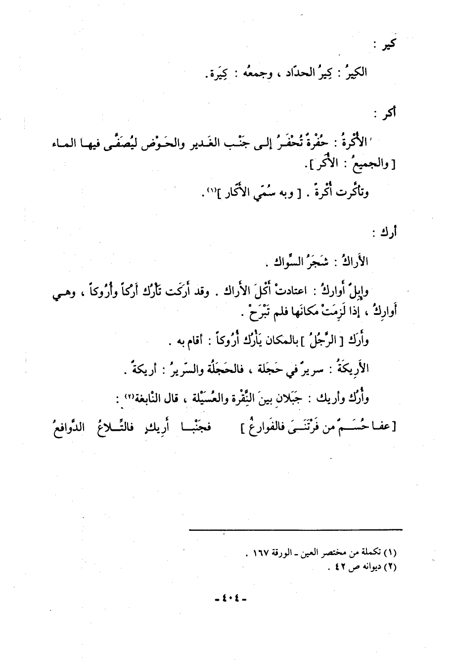 أرك: الأَراكُ: شجر السواك. وإبل أوارك: اعتادت أكل الأَراك. وقد أَرَكَت تَأْرُك أَرْكاً وأُرُوكاً وهي أَوارِكُ، إذا لزمت مكانها فلم تبرح. وأَرَك [الرجل] بالمكان يَأْرُك أُرُوكاً: أقام به. الأَرِيكَةُ: سرير في حجلة، فالحجلة والسرير: أَريكةٌ. وأُرُك وأريك: جبلان بين النقرة والعسيلة، قال النابغة «2» :