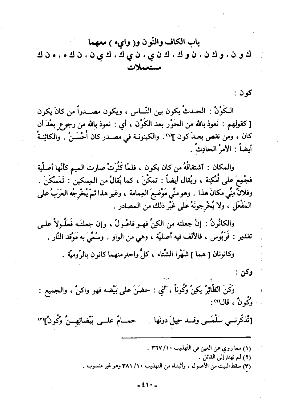باب الكاف والنون و (وا يء) معهما ك ون، وك ن، ن وك، ك ن ي، ن ي ك، ك ي ن، ن كء، ء ن ك مستعملات