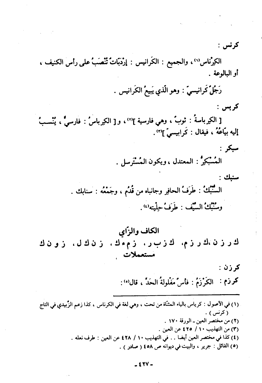 الكاف والزاي ك ر ز ن، ك ر ز م، ك ز ب ر، ز مء ك، ز ن ك ل، ز ون ك مستعملات