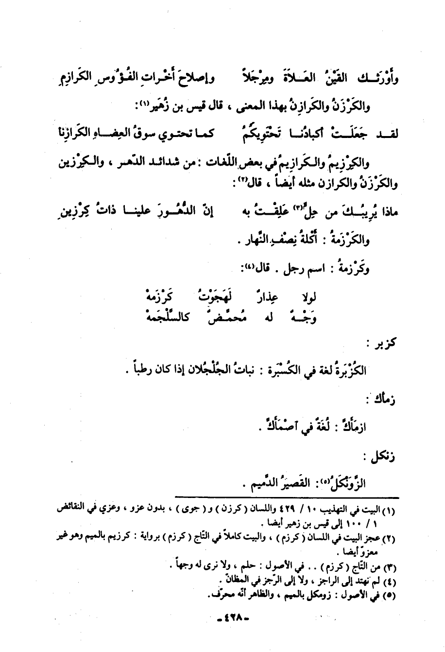 (2) عجز البيت في اللسان (كرزم) ، والبيت كاملا في التاج (كرزم) برواية: كرزيم بالميم وهو غير معزو أيضا.