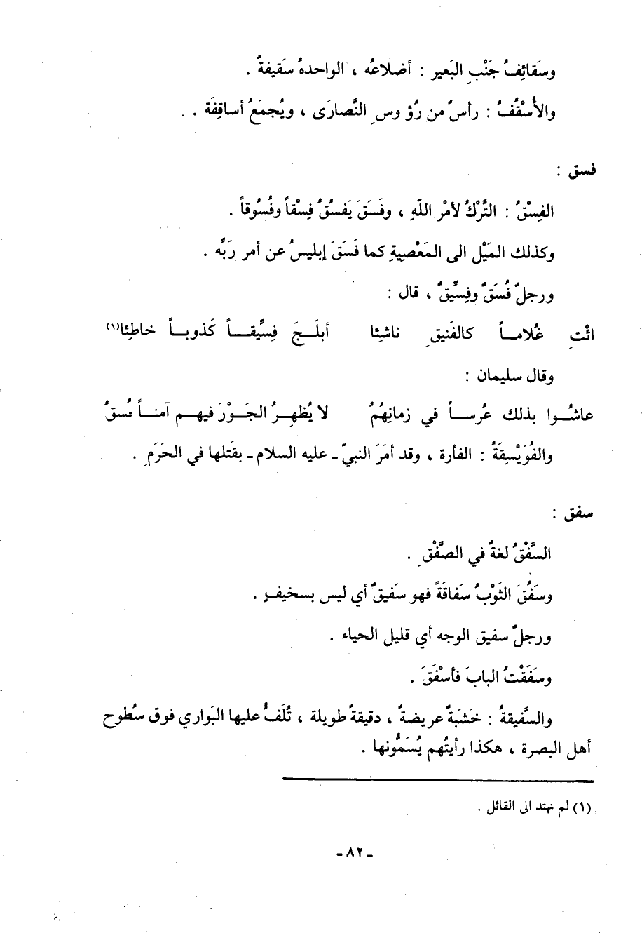 سفق: السَّفْقُ لغة في الصفق. وسَفُقَ الثوب سَفاقَةً فهو سَفيقٌ أي ليس بسخيف. ورجل سفيق الوجه أي قليل الحياء. وسَفَقْتُ الباب فأسفق. والسَّفيقةُ: خشبة عريضة، دقيقة طويلة، تلف عليها البواري فوق سطوح أهل البصرة، هكذا رأيتهم يسمونها.