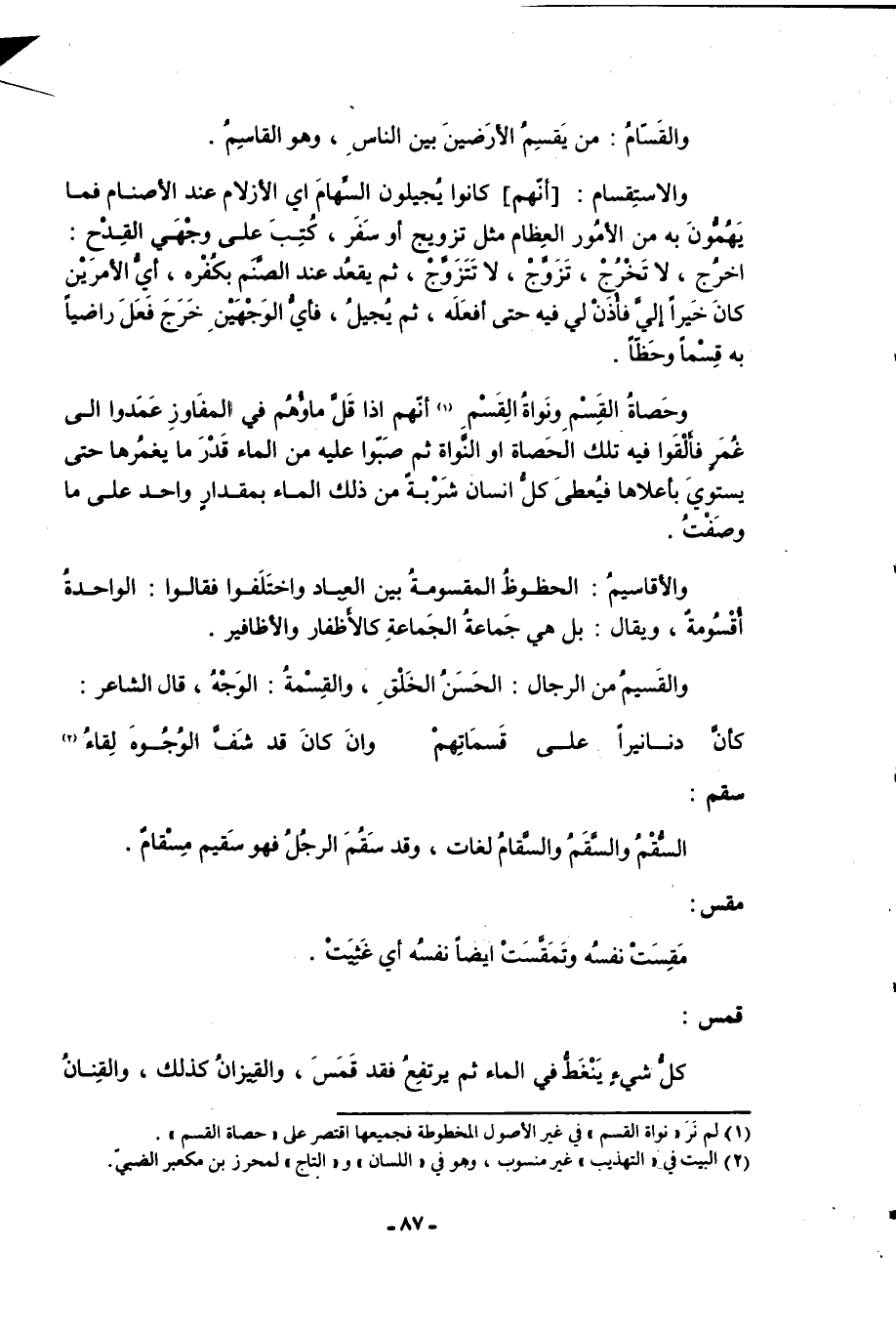 والقَسّامُ: من يَقسِمُ الأرضين بين الناس، وهو القاسِمُ. والاستِقسام: [أنهم] كانوا يجيلون السهام أي الأزلام عند الأصنام فما يهمون به من الأمور العظام مثل تزويج أو سفر، كتب على وجهي القدح: أخُرج، لا تخرج، تزوج، لا تتزوج، ثم يقعد عند الصنم بكفره، أي الأمرين كان خيراً إلي فأذن لي فيه حتى أفعله، ثم يجيل، فأي الوجهين خرج فعل راضياً به قسماً وحظاً. وحصاة القَسْمِ ونواة القَسْمِ «1» أنهم إذا قل ماؤهم في المفاوز عمدوا إلى غمر فألقوا فيه تلك الحصاة أو النواة ثم صبوا عليه من الماء قدر ما يغمرها حتى يستوي بأعلاها فيعطى كل إنسان شربة من ذلك الماء بمقدار واحد على ما وصفت. والأقاسيمُ: الحظوظ المقسومةُ بين العباد واختلفوا فقالوا: الواحدة أُقْسُومةُ، ويقال: بل هي جماعة الجماعة كالأظفار والأظافير. والقَسيمُ من الرجال: الحسن الخلق، والقِسمةُ: الوجه، قال الشاعر: