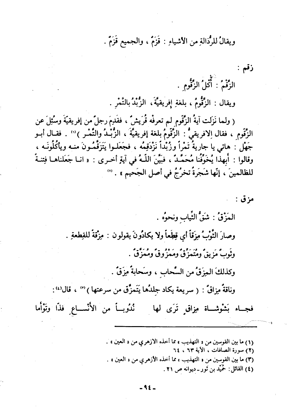زقم: الزَّقْمُ: أكل الزَّقُّومِ. ويقال: الزقوم، بلغة إفريقية، الزبد بالتمر. (ولما نزلت آية الزَّقّومِ لم تعرفه قريش، فقدم رجل من إفريقية وسئل عن الزَّقّومِ، فقال الإفريقي: الزَّقّومُ بلغة إفريقية، الزبد والتمر) «1» . فقال أبو جهل: هاتي يا جارية تمراً وزبداً نَزْدَقِمُه، فجعلوا يَتَزَقَّمُونَ منه ويأكلونه، وقالوا: أبهذا يخوفنا محمد، فبين الله في آية أخرى: إِنَّا جَعَلْناها فِتْنَةً لِلظَّالِمِينَ، إِنَّها شَجَرَةٌ تَخْرُجُ فِي أَصْلِ الْجَحِيمِ «2» .