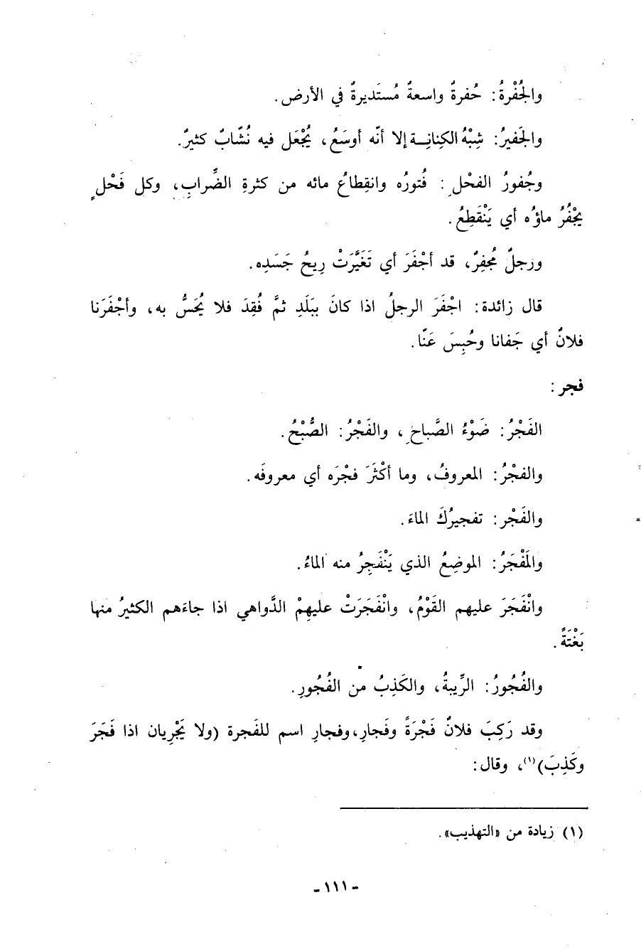 فجر: الفَجرُ: ضوءُ الصباحِ، والفَجرُ: الصُّبحُ. والفجرُ: المعروفُ، وما أكثر فجرَه أي معروفه. والفَجر: تفجيرُكَ الماءَ. والمَفجَرُ: الموضع الذي يَنفَجِرُ منه الماءُ. وانفجرَ عليهم القومُ، وانفجرت عليهم الدَّواهي إذا جاءهم الكثيرُ منها بغتة. والفُجُورُ: الرِّيبةُ، والكذبُ من الفُجُورِ. وقد ركب فلانٌ فجرة وفجار، وفَجارِ اسم للفَجرة (ولا يجريان إذا فَجَرَ وكذب) «1» ، وقال: