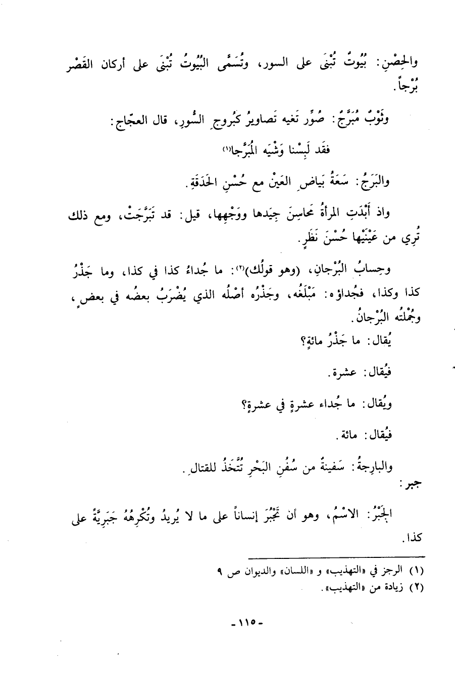 والبرجُ: سعةُ بياضِ العين مع حُسنِ الحدقةِ. وإذا أبدت المرأة مَحاسن جِيدها ووجهها، قيل: قد تَبَرَّجت، ومع ذلك تُرِي من عَينيها حُسنَ نَظَرٍ. وحِسابٌ البُرجانِ، (وهو قولُك) «2» : ما جُداءُ كذا في كذا، وما جَذرُ كذا وكذا، فجُداؤه: مَبلغُه، وجَذره أصله الذي يضرب بعضه في بعضٍ، وجُملتُه البُرجانُ. يُقال: ما جَذرُ مائةٍ؟ فيُقال: عشرة. ويُقال: ما جُداء عشرةٍ في عشرةٍ؟ فيُقال: مائة. والبارِجةُ: سفينة من سُفن البحر تُتَّخذُ للقتال.