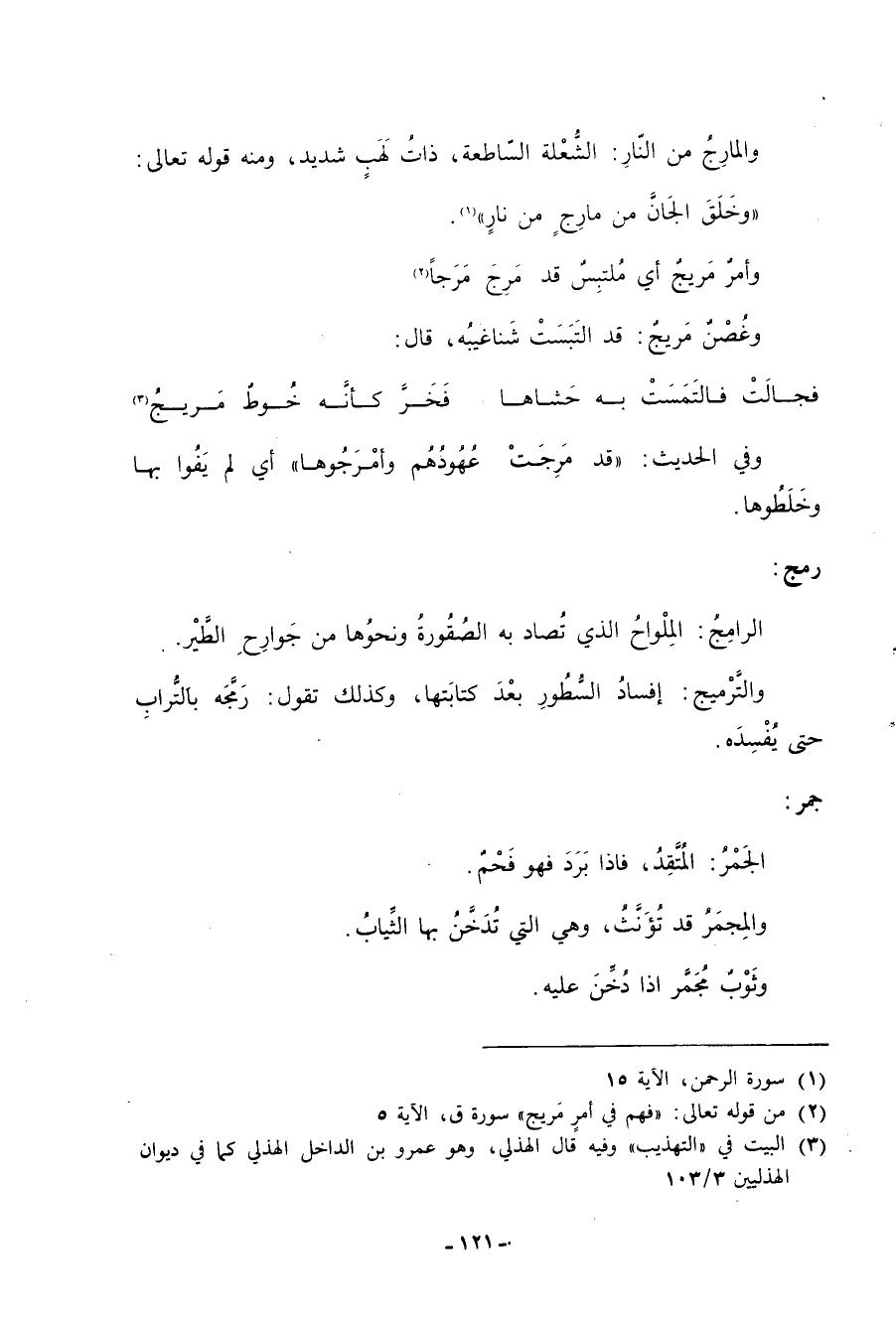 والمارِجُ من النّارِ: الشُّعلة السّاطعة، ذات لهبٍ شديد، ومنه قوله تعالى: وَخَلَقَ الْجَانَّ مِنْ مارِجٍ مِنْ نارٍ «1» . وأمرٌ مَريجٌ أي مُلتبِسٌ قد مَرجَ مَرَجاً «2» وغُصنٌ مَريجٌ: قد التَبَسَت شناغيبه، قال: