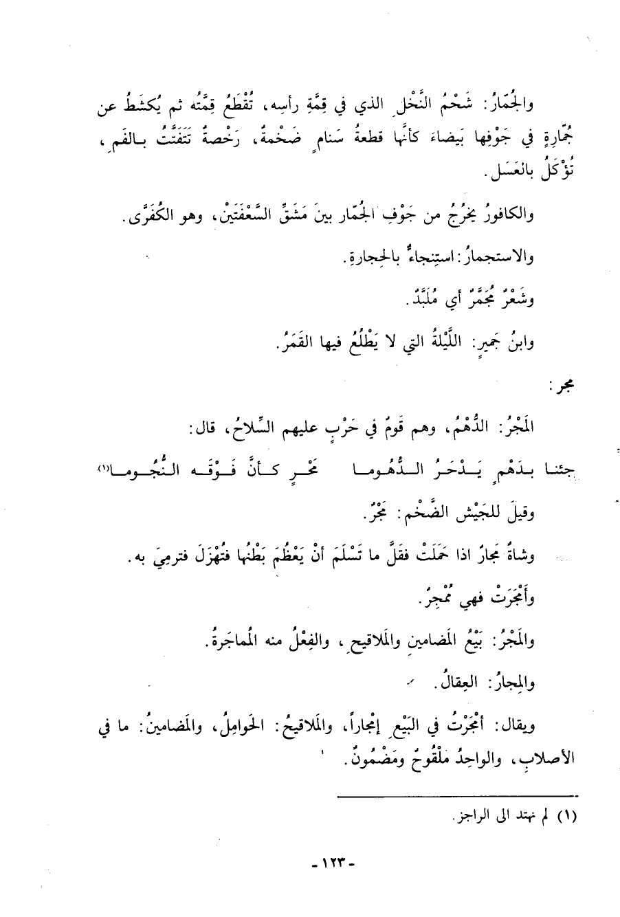 والجُمّارُ: شَحمُ النخل الذي في قِمةِ رأسهِ، تُقطع قِمتُه ثم يكشط عن جُمّارِةٍ في جوفها بيضاء كأنَّها قطعةُ سَنامٍ ضخمةٌ، رخصةٌ تتفتَّتُ بالفَمِ، تؤكلُ بالعسل. والكافورُ يُخرجُ من جَوف الجُمّار بين مَشقِّ السعفَتين، وهو الكُفرَّى. والاستجمارُ: استِنجاءٌ بالحجارة. وشعرٌ مُجمَّرٌ أي مُلبدٌ. وابن جَميرٍ: اللَّيلة التي لا يطلعُ فيها القمرُ.
