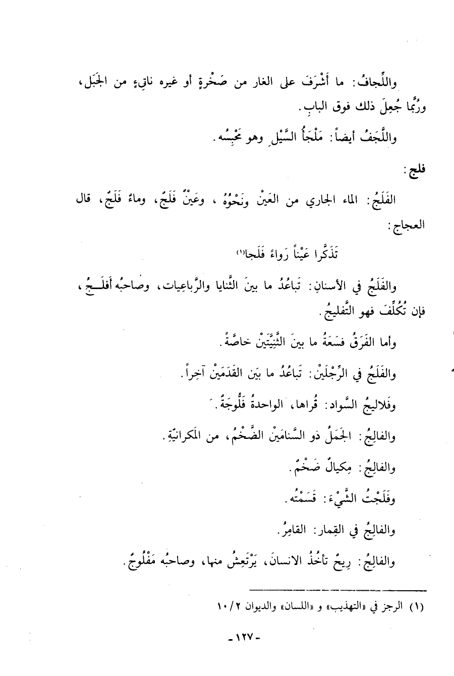 فلج: الفَلَجُ: الماء الجاري من العين ونَحوه، وعين فلج، وماء فَلَجٌ، قال العجّاج: