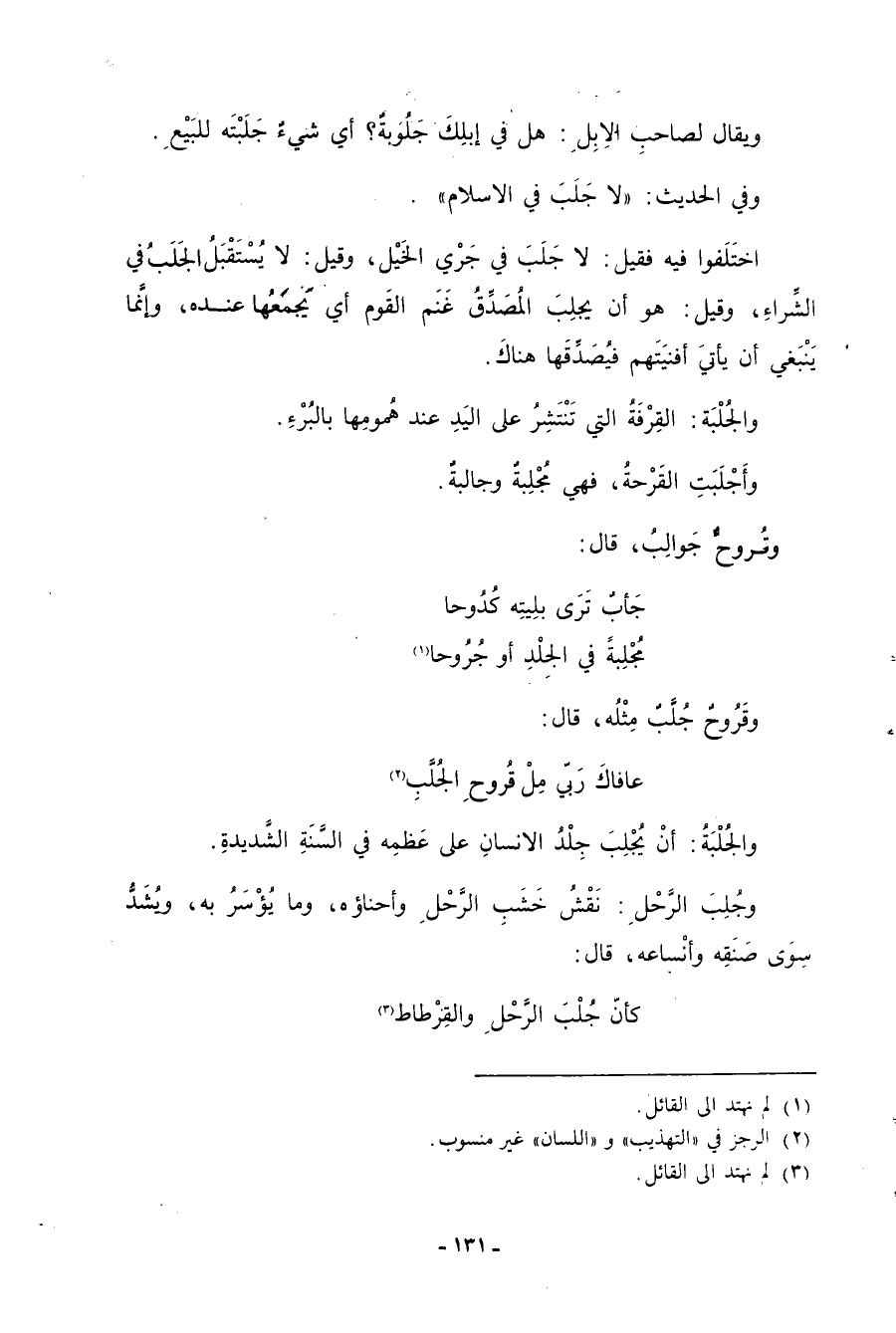 اختلفوا فيه فقيل: لا جَلبَ في جَري الخَيل، وقيل: لا يُستقبلُ الجَلَبُ في الشِّراءِ، وقيل: هو أن يجلبَ المُصدِّقُ غَنَم القوم أي يجمعها عنده، وإنما ينبغي أن يأتي أفنيتهم فيصدِّقها هناك. والجُلبة: القِرفةُ التي تنتشر على اليد عند هُمومِها بالبُرءِ. وأجلبتِ القرحةُ، فهي مُجلبةٌ وجالبةٌ. وقُروحٌ جَوالِبُ، قال: