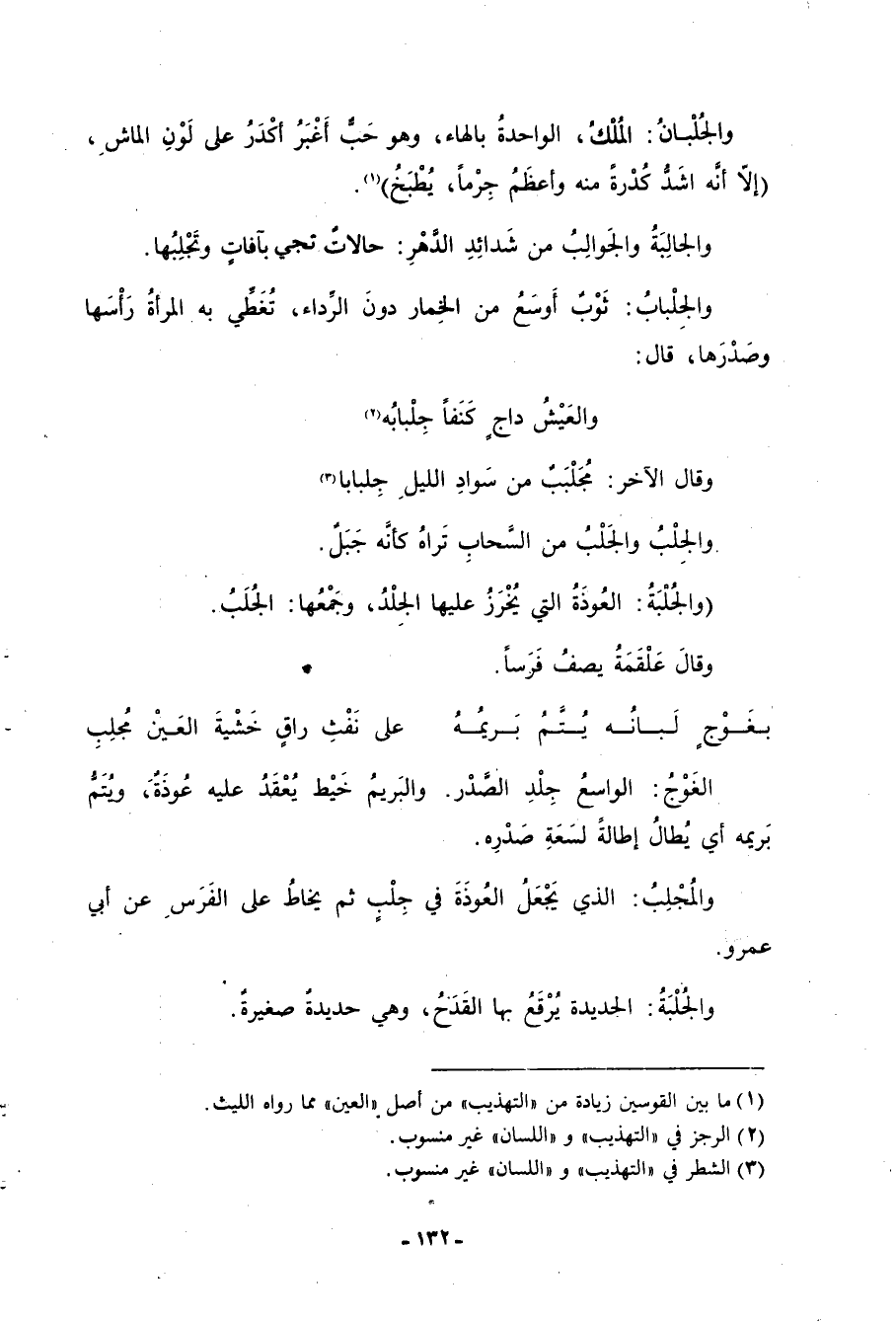 والجُلبان: المُلك، الواحدة بالهاء، وهو حبّ أغبر أكدر على لون الماشِ، (إلا أنه أشدّ كُدرةً منه وأعظم جِرماً، يُطبخ) «1» . والجالبة والجوالب من شدائد الدهر: حالات تجيء بآفاتٍ وتَجْلبها. والجِلباب: ثوبٌ أوسع من الخِمار دون الرداء، تُغطّي به المرأة رأسها وصدرها، قال: