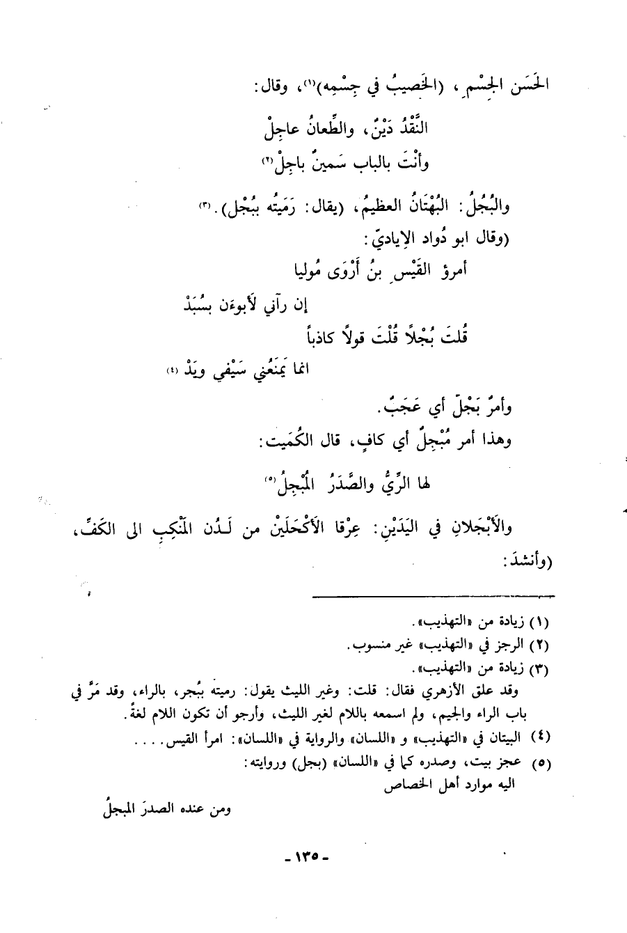 وأمر بجل أي عَجَبٌ. وهذا أمر مُبجِلٌ أي كافٍ، قال الكُمَيت: لها الرِّيُّ والصَّدرُ المَبجِلُ «5» والأبجلانِ في اليَدين: عرقا الأكحلين من لدن المَنكِبِ إلى الكفِّ، (وأنشدَ: