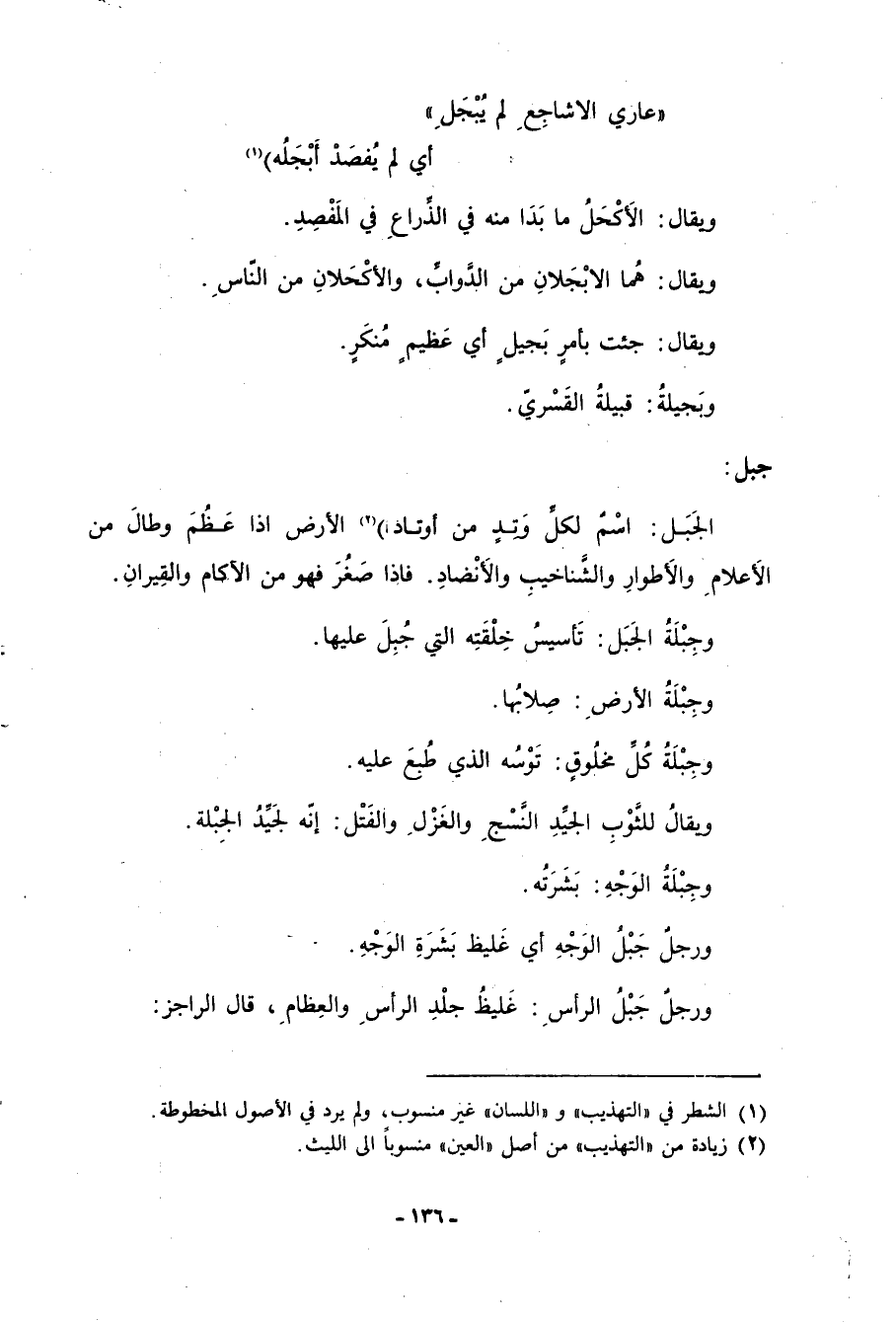 جبل: الجَبَل: اسمٌ لكلِّ وتدٍ من أوتاد) «2» الأرض إذا عظم وطال من الأعلامِ والأطوارِ والشَّناخيب والأنضادِ. فإذا صغر فهو من الأكام والقِيرانِ. وجِبلَةُ الجبَل: تأسيس خلقته التي جُبِلَ عليها. وجِبلةُ الأرضِ: صِلابُها. وجِبلةُ كلِّ مخلوقٍ: توسُه الذي طُبع عليه. ويقال للثَّوبِ الجيِّد النَّسجِ والغزلِ والفتل: إنه لجيد الجبلة. وجبلة الوجه: بَشرتُه. ورجلٌ جَبلُ الوجه أي غليظ بشرةِ الوجهِ. ورجل جَبلُ الرأسِ: غليظُ جلد الرأس والعِظامِ، قال الراجز: