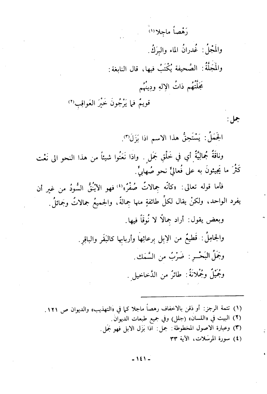 «4» فهو الأينقُّ السُّودُ من غير أن يفرد الواحد، ولكن يقال لكلِّ طائفةٍ منها جِمالةٌ، والجميع جمالاتٌ وجَمائلُ. وبعض يقول: أراد جِمالاً لا نُوقاً فيها. والجامِلُ: قطيعٌ من الإبل برعائِها وأربابها كالبقر والباقر. وجَمَلُ البحر: ضربٌ من السَّمك. وجُميلٌ وجُملانةٌ: طائرٌ من الدخاخيل.