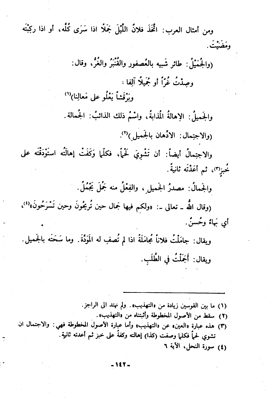 والجَميلُ: الإهالةُ المُذابةُ، واسم ذلك الذائبُ: الجُمالة. (والاجتِمال: الإدِّهان بالجميلِ) «2» . والاجتمالُ أيضاً: أن تَشوى لحَماً، فكلّما وكفت إهالتُه استودقته على خبز «3» ثم أعدته ثانيةً. والجَمالُ: مصدر الجميلِ، والفعلُ منه جَمُلَ يَجمُلُ. (وقال الله- تعالى-: وَلَكُمْ فِيها جَمالٌ حِينَ تُرِيحُونَ وَحِينَ تَسْرَحُونَ