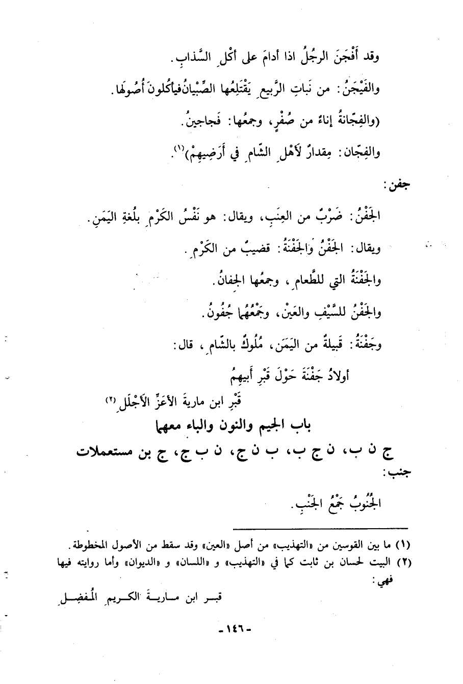 وقد أَفْجَنَ الرّجلُ إذا أدام على أكل السَّذابِ. والفَيجنُ: من نبات الربيع يقتلعها الصبيان فيأكلون أصولها. (والفجانة إناء من صُفْرٍ، وجمعها: فَجاجين. والفِجّان: مقدارٌ لأهل الشام في أرضيهم) «1»