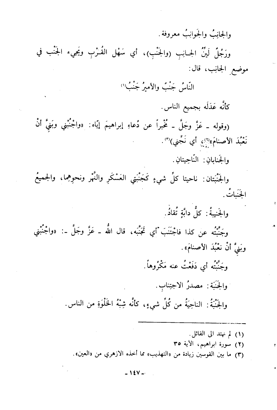 . والجَنابانِ: النّاحِيتانِ. والجَنبتان: ناحيتا كلِّ شيءٍ كجَنَبتي العسكر والنَّهر ونحوهِما، والجميعُ الجَنَباتُ. والجَنيبةُ: كلُّ دابَّةٍ تُقادُ. وجَنَّبتُه عن كذا فاجتَنَبَ أي تَجنَّبه، قال اللُّه- عز وجلَّ-: وَاجْنُبْنِي وَبَنِيَّ أَنْ نَعْبُدَ الْأَصْنامَ