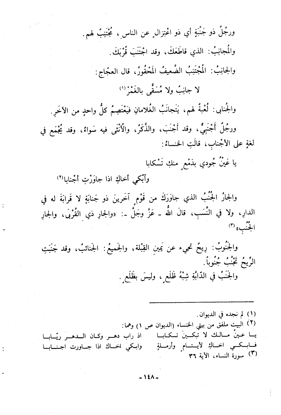والجُنابى: لُعبةٌ لهم، يَتَجانبُ الغُلامانِ فيعتصمُ كلُّ واحدٍ من الآخر. ورجلٌ أجنبِّي، وقد أجنبَ، والذَّكرُ، والأنثى فيه سواءٌ، وقد يجمع في لغةٍ على الأجنابِ، قالت الخنساءُ: