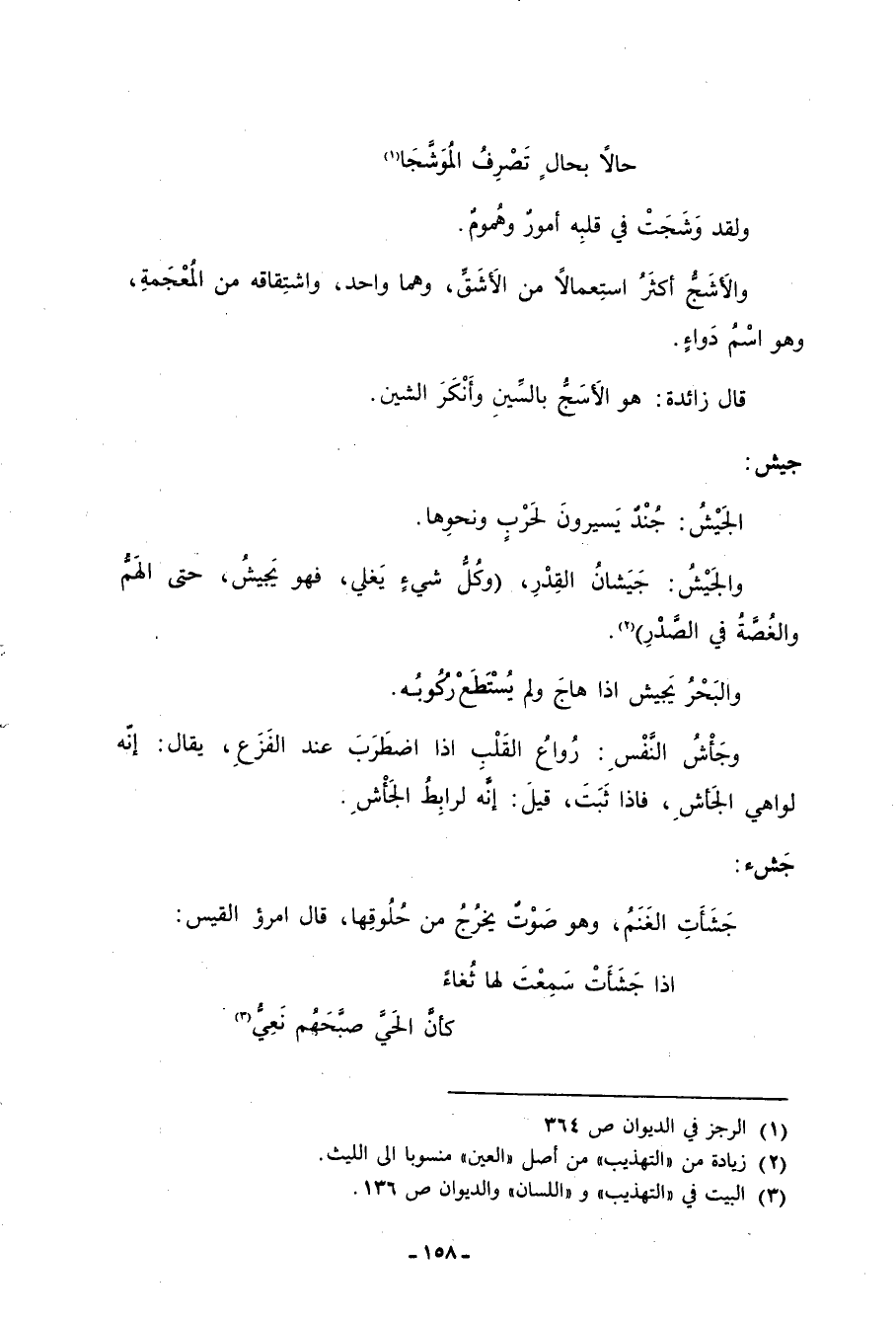 جيش: الجَيشُ: جُند يسيرون لحربٍ ونحوها. والجيشُ: جَيشانُ القِدرِ، (وكل شيءٍ يغلي، فهو يجيشُ، حتى الهمُّ والغُصةُ في الصدر) «2» . والبحرُ يجيش إذا هاجَ ولم يُستطع ركوبه. وجأشُ النَّفسِ: رُواع القلبِ إذا اضطرب عند الفزع، يقال: إنه لواهي الجأشِ، فإذا ثبت، قيل: إنه لرابط الجأش.
