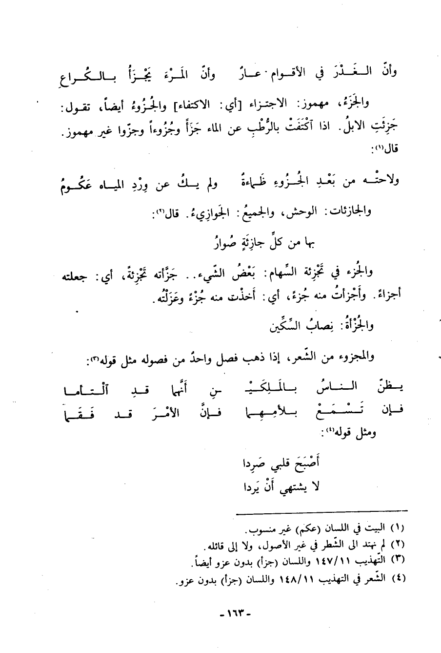والجّزءُ، مهموز: الاجتزاء [أي: الاكتفاء] والجُزُوءُ أيضاً، تقول: جَزِئَتِ الإبلُ. إذا اكتفت بالرطب عن الماء جَزَأً وجزوءاً وجزّوا غير مهموز. قال «1» :
