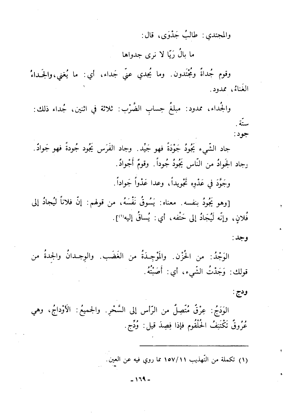 جود: جاد الشّيء يَجُودُ جَودَةً فهو جيد. وجاد الفرس يجود جُودةً فهو جوادٌ. وجاد الجواد من الناس يَجُودُ جُوداً. وقومٌ أجوادٌ. وجَوَّدَ في عدوِه تجويداً، وعدا عدواً جواداً. [وهو يَجُودُ بنفسه. معناه: يسوق نفسه، من قولهم: إن فلاناً ليُجادُ إلى فلانٍ، وإنه ليُجادُ إلى حتفه، أي: يُساقُ إليه «1» ]