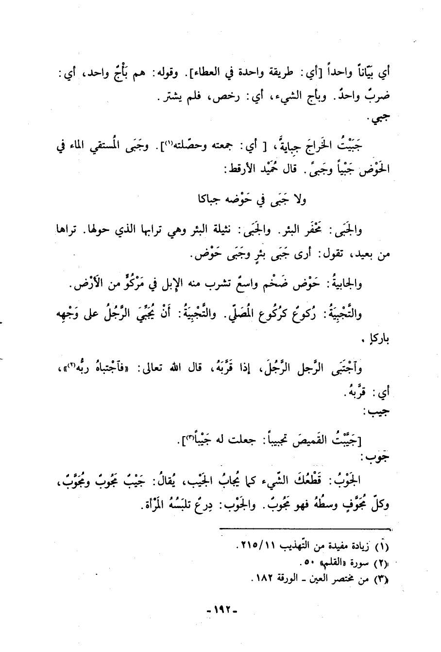 والجَبَى: محفر البئر. والجَبَى: نثيلة البئر وهي ترابها الذي حولها. تراها من بعيد، تقول: أرى جَبَى بئرٍ وجَبَى حَوض. والجابيةُ: حوض ضخم واسعٌ تشرب منه الإبل في مركو من الأرض والتَّجبِيةُ: ركوعً كركوع المُصلي. والتَّجبِيةُ: أن يُجبِّي الرَّجل على وجههِ باركاً. واجتبى الرَّجل الرَّجُلَ، إذا قربهُ، قال الله تعالى. فَاجْتَباهُ رَبُّهُ