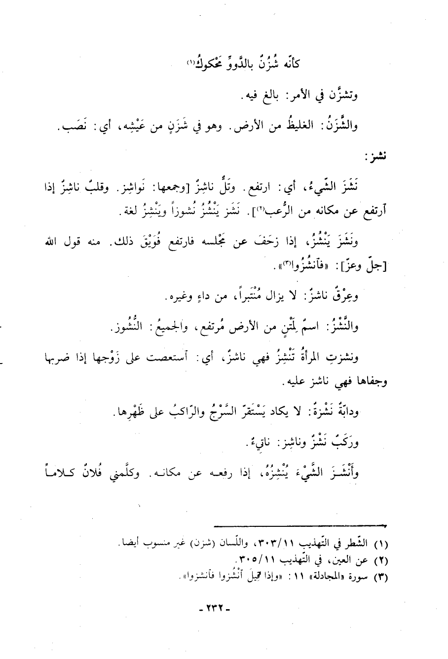 نشز: نشزَ الشيءُ، أي: ارتفع. وتلٌّ ناشزٌ [وجمعها: نواشِز. وقلبٌ ناشزٌ إذا ارتفع عن مكانه من الرُّعب «2» ] . نشز ينشز نشوزا وينشز لغة. ونشزَ ينشز، إذا زحف عن مجلسه فارتفع فويق ذلك. منه قول الله [جل وعزّ] : فَانْشُزُوا «3» وعرق ناشز: لا يزال مُنتبراً، من داءٍ وغيره. والنشز: اسم لمتن من الأرض مرتفع، والجميع: النُّشوز. ونشزتِ المرأةُ تنشِزُ فهي ناشزٌ، أي: استعصت على زوجها إذا ضربها وجفاها فهي ناشز عليه. ودابةٌ نشزةٌ: لا يكاد يستقر السَّرجُ والراكب على ظهرها. وركبٌ نشزٌ وناشز: ناتيءُ. وأنشزَ الشَّيءَ يُنشزه، إذا رفعه عن مكانه. وكلمني فلان كلاما